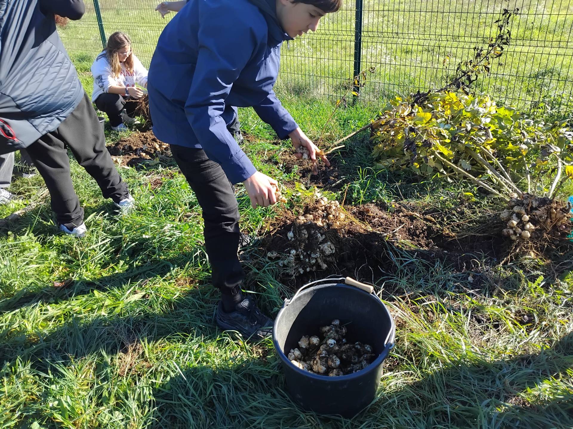 Au site Agro-éco ils ont récolté les framboises et les topinambours puis ils ont préparé avec l'apport de compost de dechets verts la planche de culture qui accueillera les pommes de terre. Ils ont aussi paillé les cultures de navets et planté les fraisiers.