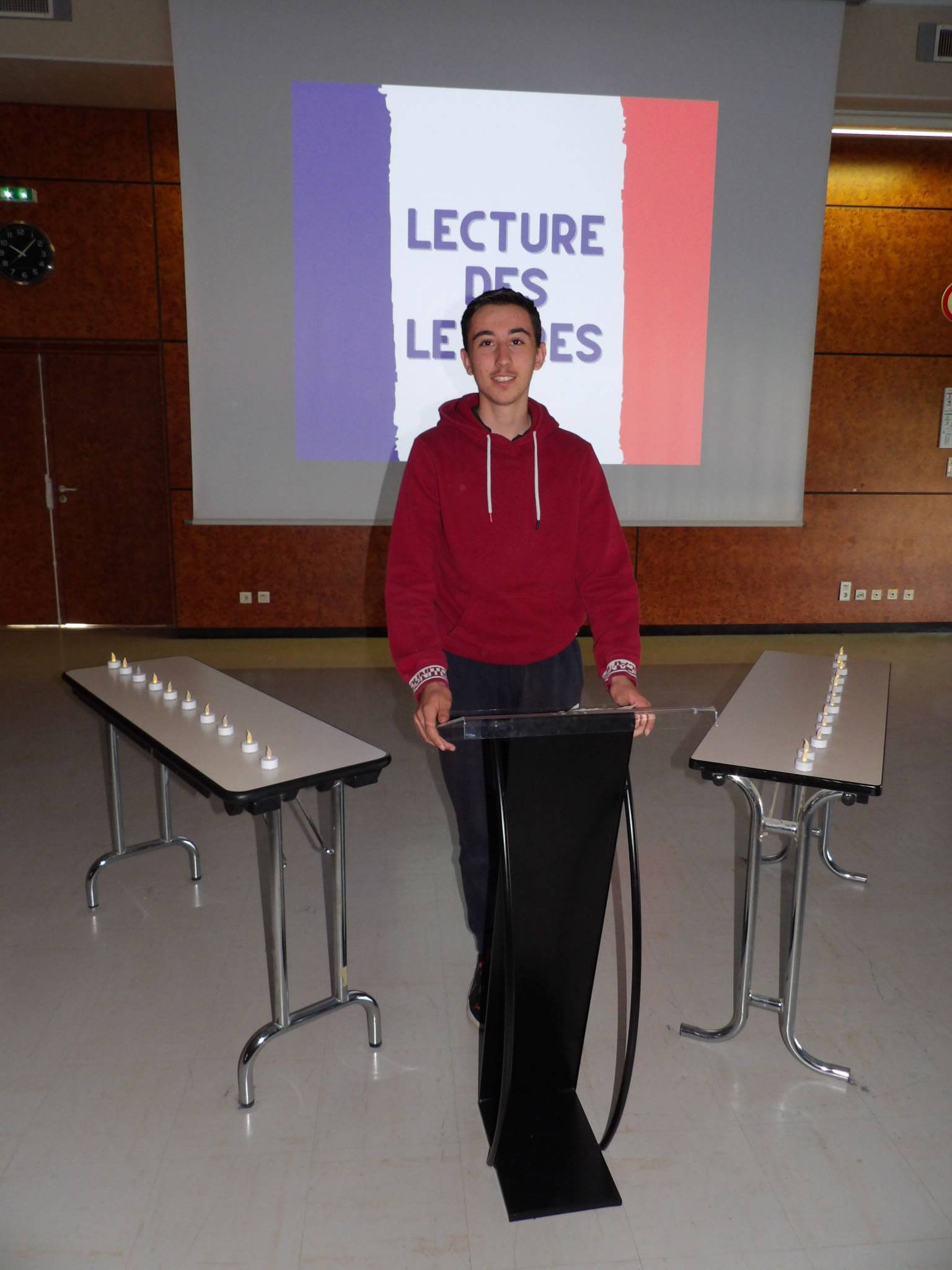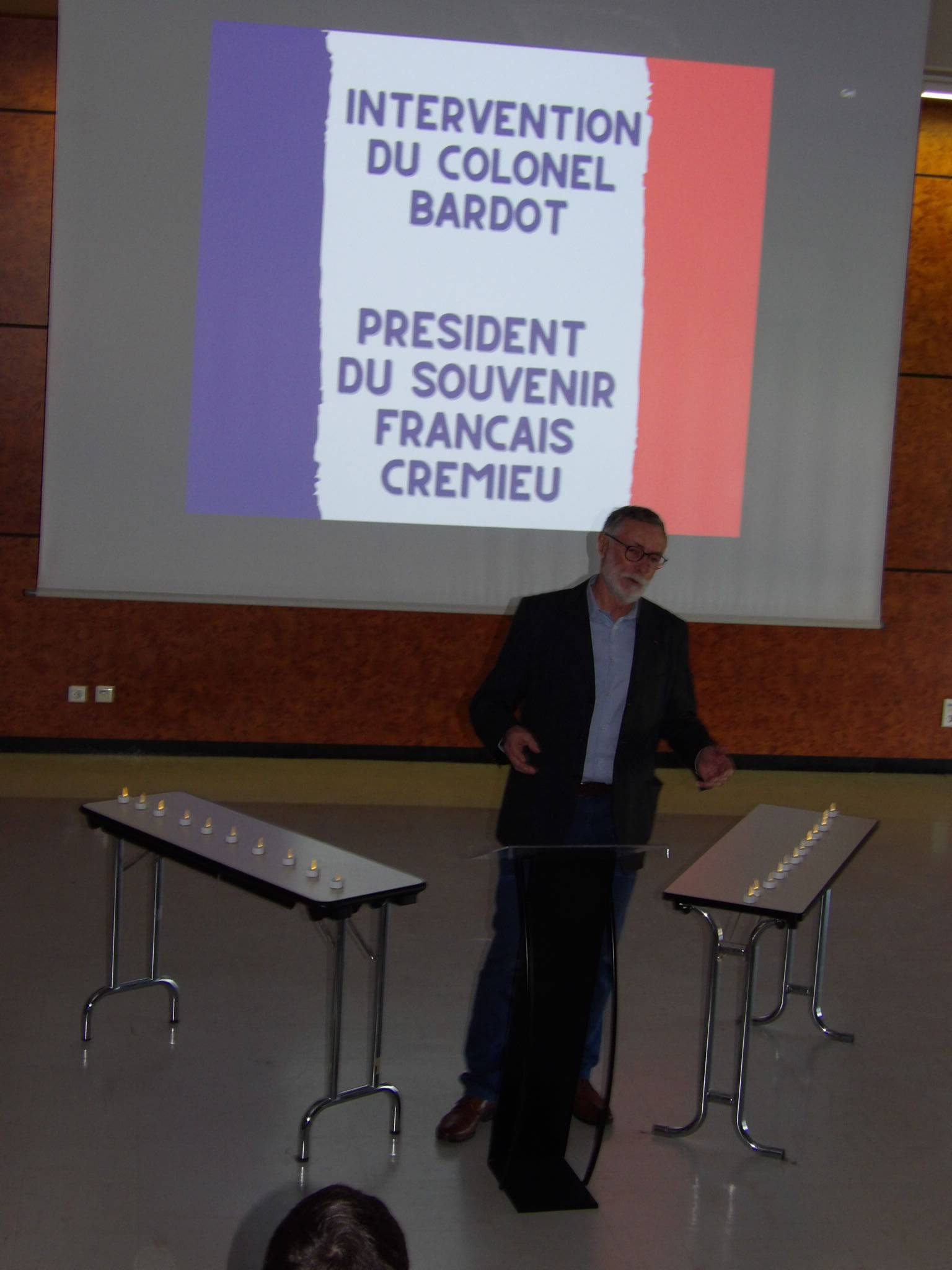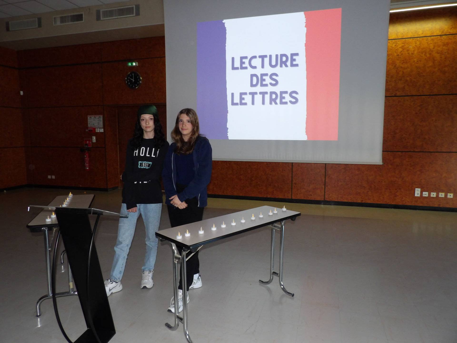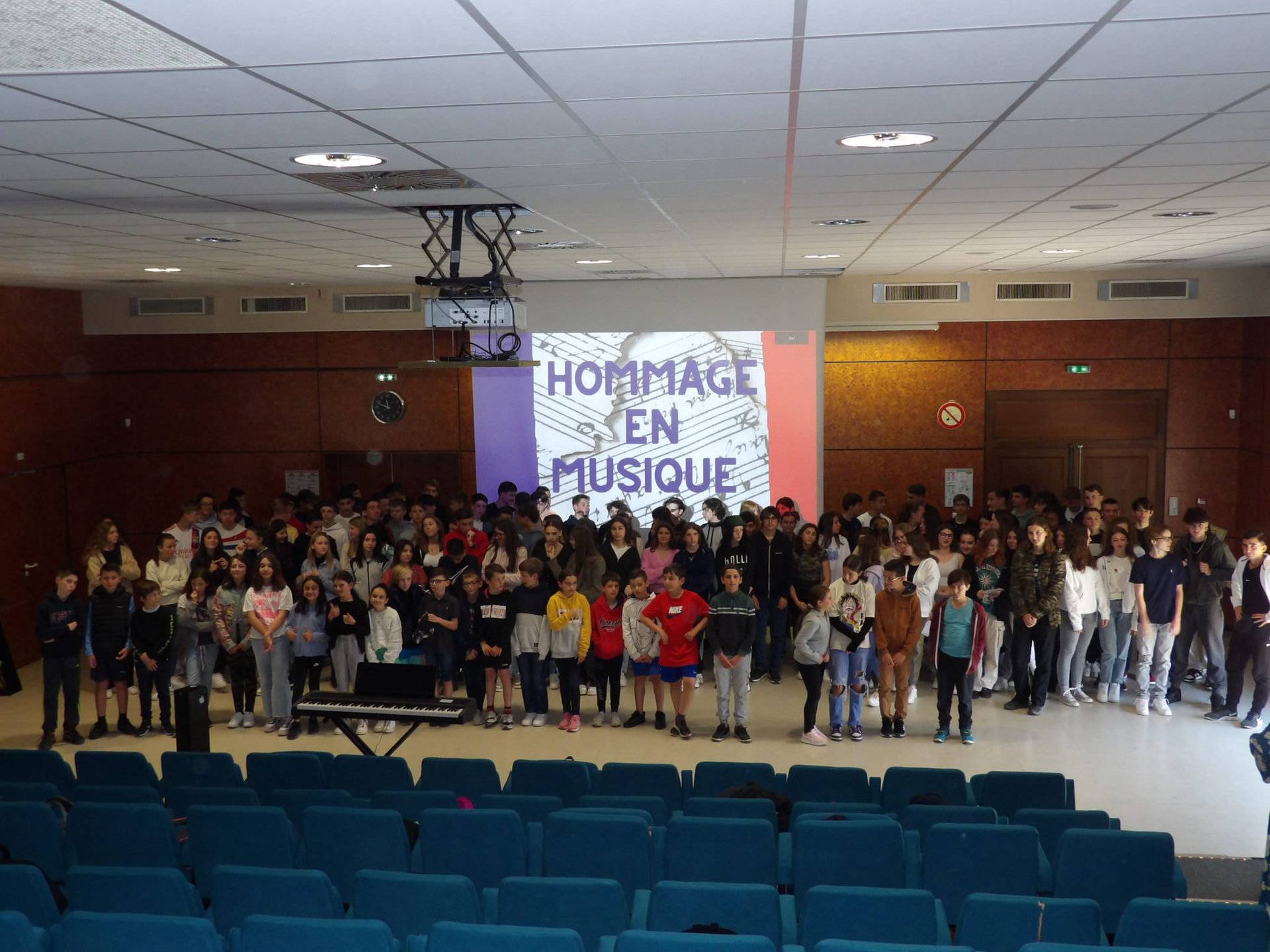 La restitution de ces courriers s’est déroulée le jeudi 4 mai, dans l’amphithéâtre Paul Claudel, en présence de l’ensemble des classes de Troisième et des élèves de primaire impliqués dans ce projet. Le Colonel Bardot est intervenu au cours de cette séance, afin d’exposer aux élèves le rôle joué par les gaz lors de cette guerre, ainsi que l’importance de perpétuer le souvenir de ces combattants. Nous le remercions une nouvelle fois pour son investissement et le temps accordé pour nos élèves. Cette séance s’est conclue par des chants sur le thème de la guerre (chanson de Craonne, le soldat de Florent Pagny), appris par tous les élèves dans le cadre des cours d'Education Musicale.