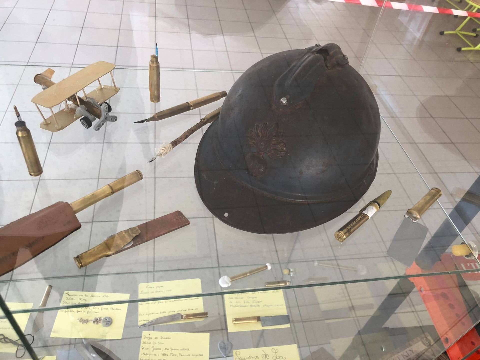 L’autre temps fort de cette journée est l’exposition organisée par les élèves et enseignants au foyer de l’établissement, où ont été exposés les courriers rédigés par nos élèves à l’encre, sur support vieilli, très réalistes, ainsi que de précieux objets aimablement prêtés par les familles de nos élèves : grenades, obus, croquis, objets fabriqués à partir d’obus dans les tranchées, casques …