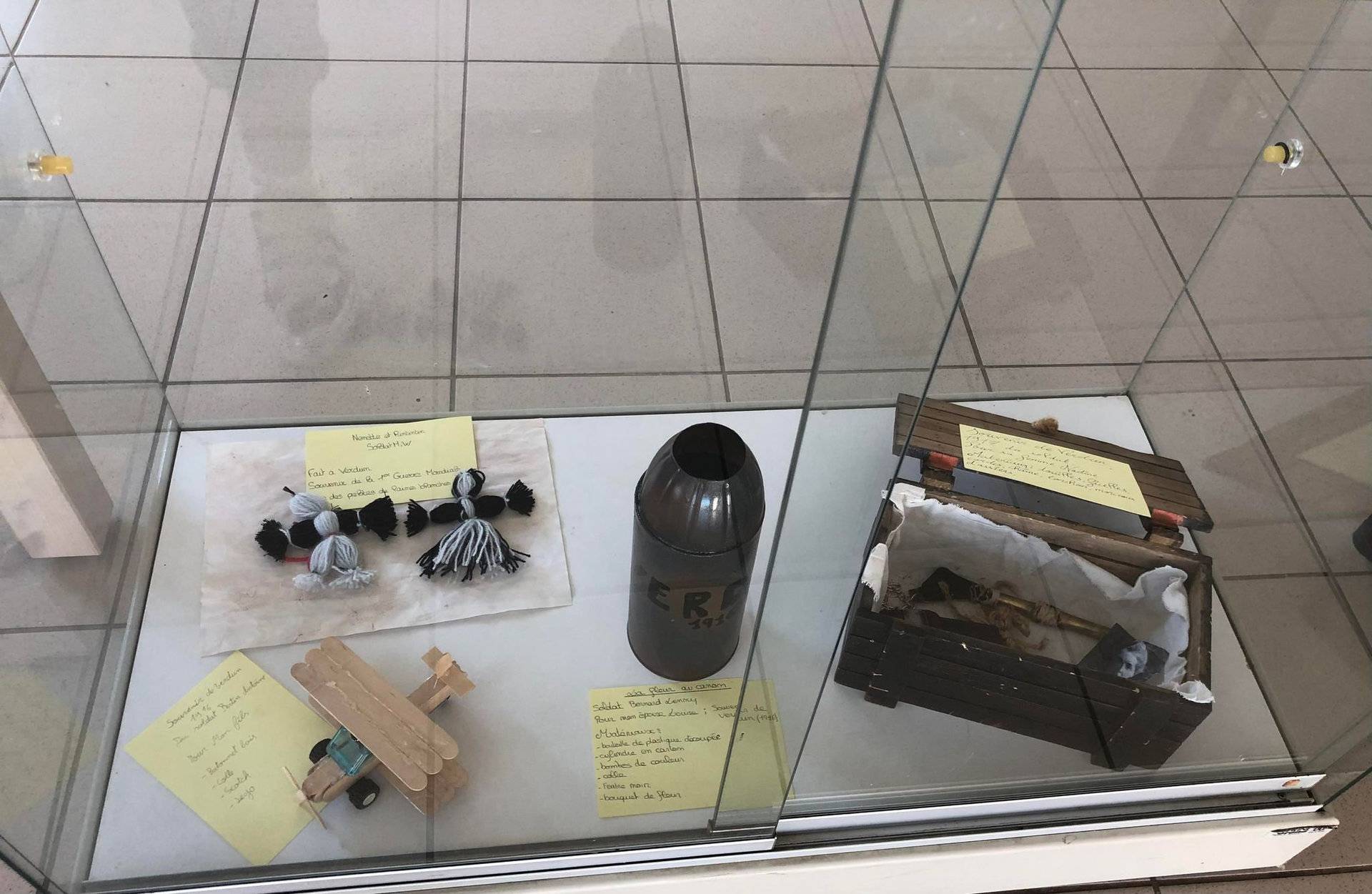 Afin d’aller jusqu’au bout de cette démarche immersive, nos élèves de Troisième ont réalisé par eux-mêmes, en Arts Plastiques, des objets semblables à ceux fabriqués par les soldats ou leurs familles, qui étaient exposés avec leurs lettres.