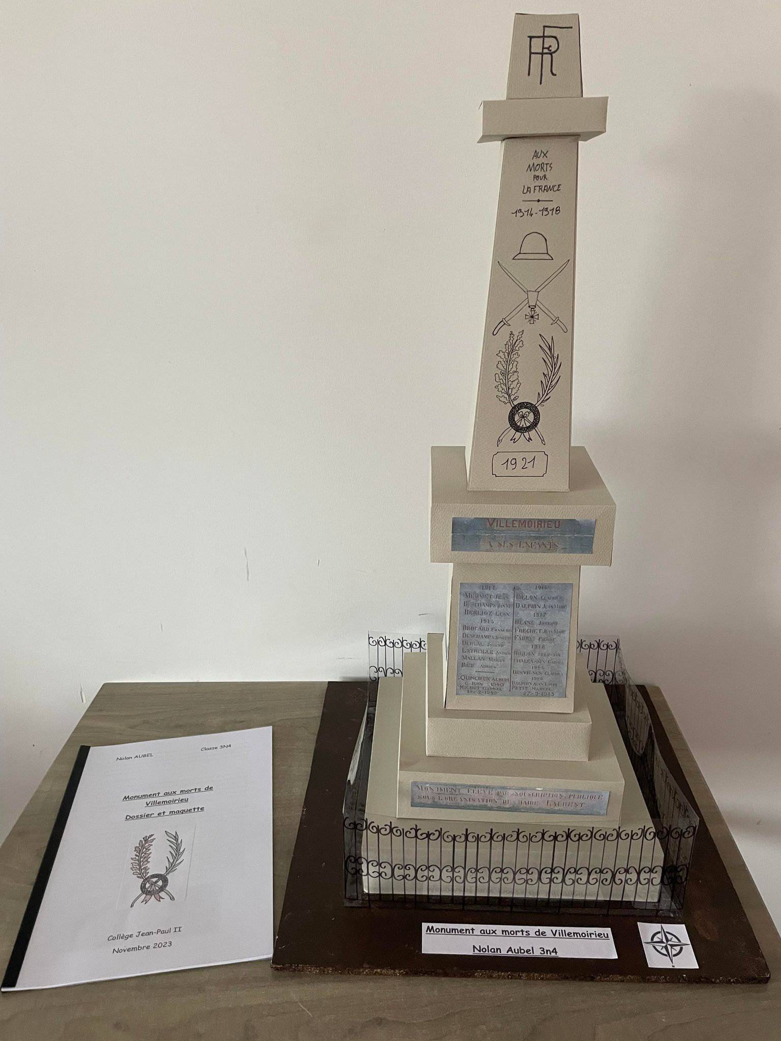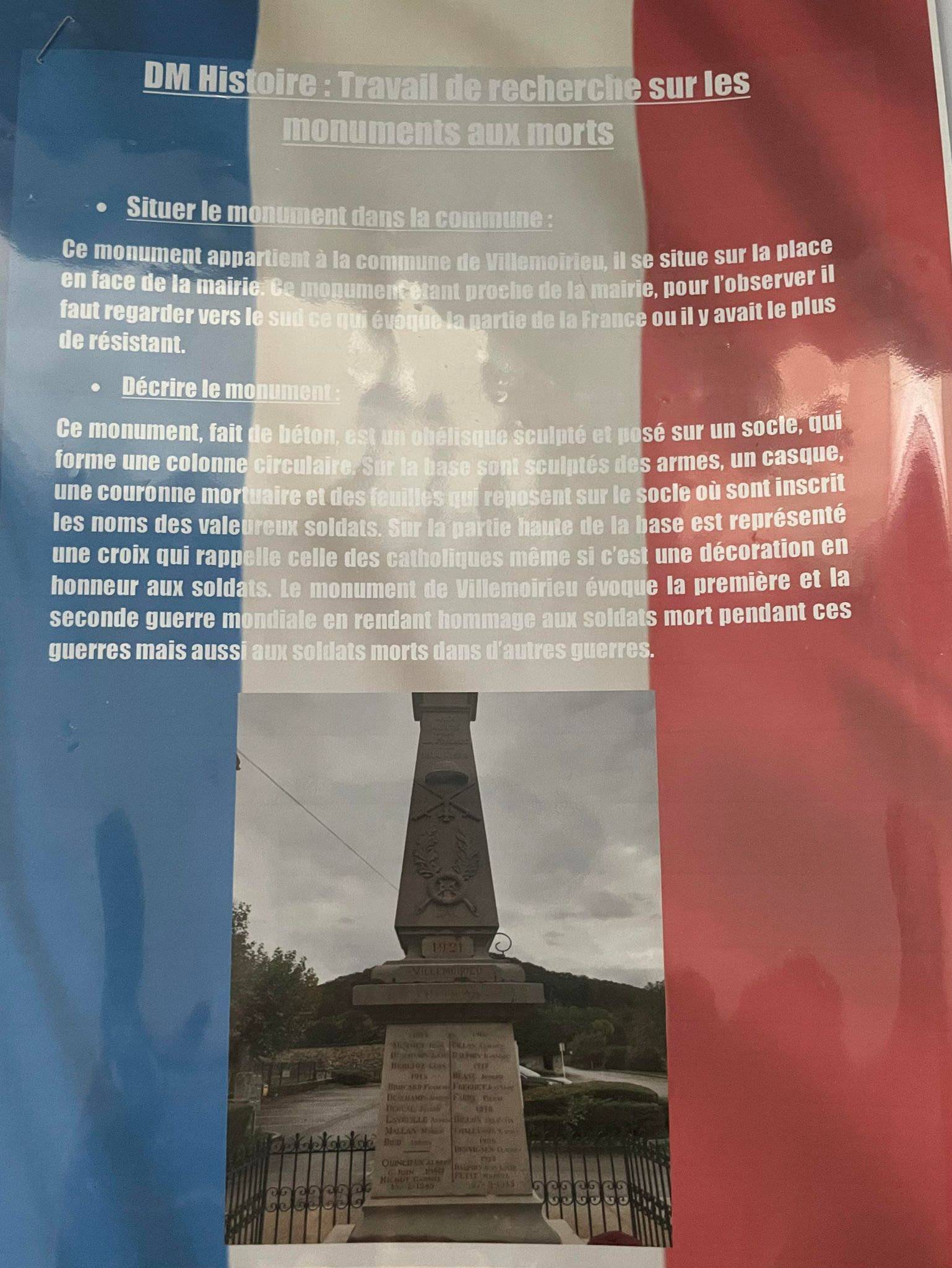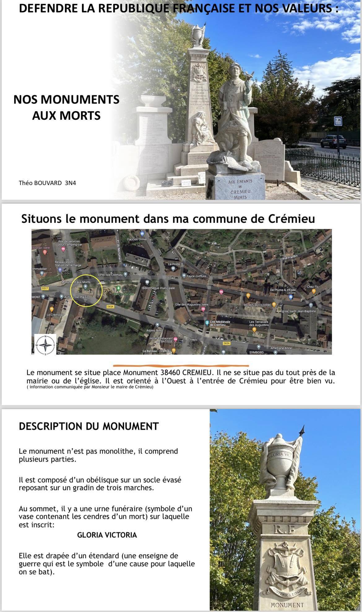 « Un peuple qui oublie son passé se condamne à le revivre », célèbre citation de Winston CHURCHILL reprise par un élève de 3N1 dans son travail sur les monuments aux morts. L’objectif du travail de mémoire autour de ces monuments a alors pris sens. Les élèves de 3N1 et 3N4 ont fait preuve d’originalité avec des supports variés; affiches, dossier, flyer, gazette, diaporama, Génially et d’implication dans chaque présentation du monument de leur commune ou d'une commune pour laquelle ils étaient attachés. Pour certains, cela leur a permis de découvrir ce lieu, d’autres de l’analyser plus spécialement. Des élèves de Villemoirieu et de Crémieu se sont particulièrement illustrés dans leur description. Nous félicitons l’ensemble des élèves et en particulier Nolan AUBEL qui a construit une maquette du monument aux morts de Villemoirieu pour compléter son travail.