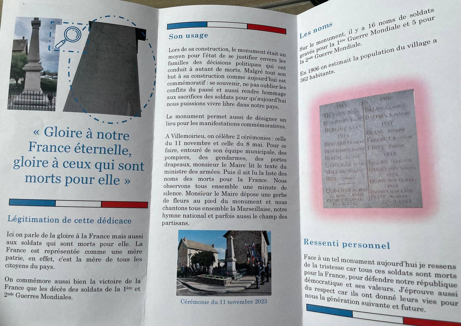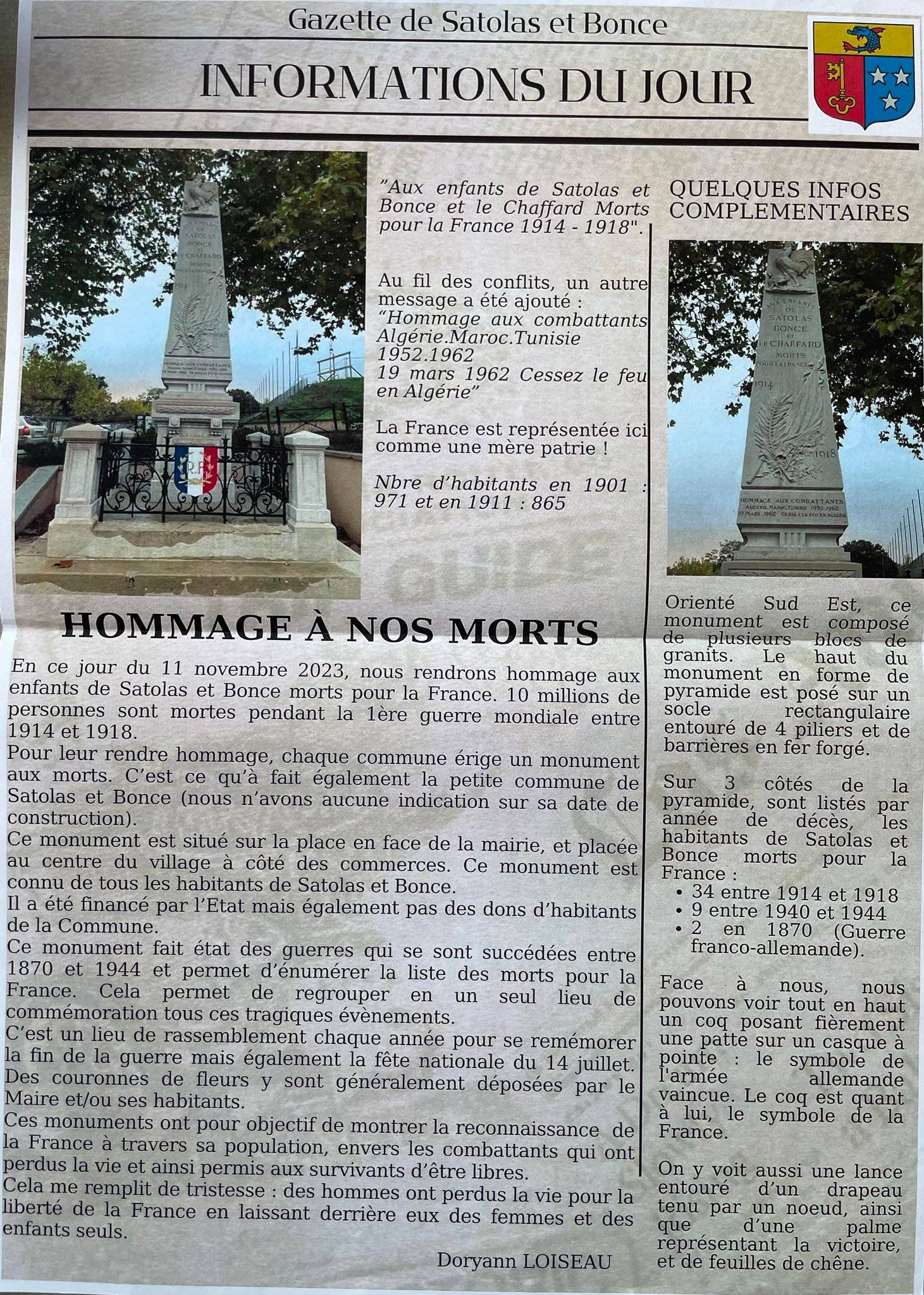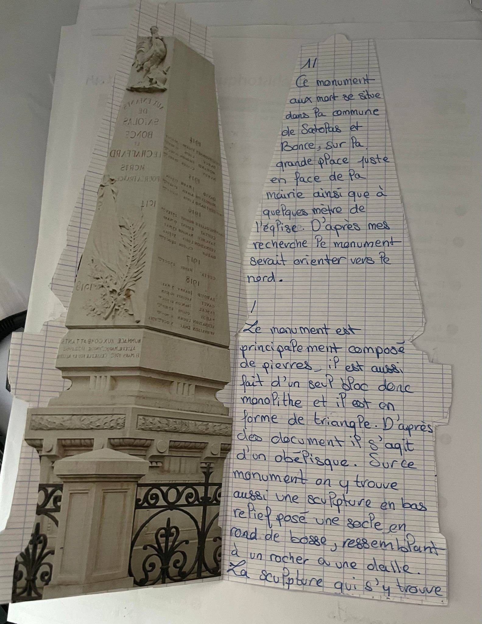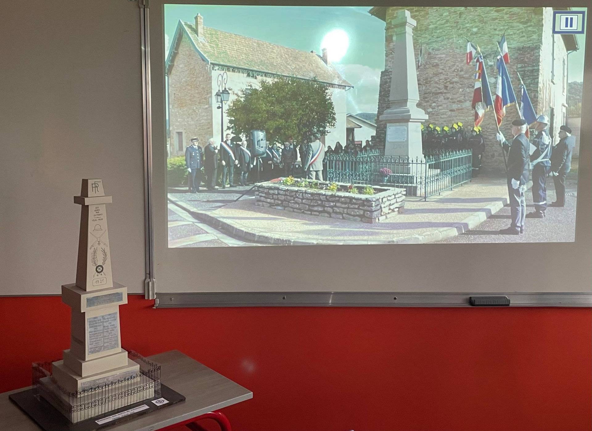 « Un peuple qui oublie son passé se condamne à le revivre », célèbre citation de Winston CHURCHILL reprise par un élève de 3N1 dans son travail sur les monuments aux morts. L’objectif du travail de mémoire autour de ces monuments a alors pris sens. Les élèves de 3N1 et 3N4 ont fait preuve d’originalité avec des supports variés; affiches, dossier, flyer, gazette, diaporama, Génially et d’implication dans chaque présentation du monument de leur commune ou d'une commune pour laquelle ils étaient attachés. Pour certains, cela leur a permis de découvrir ce lieu, d’autres de l’analyser plus spécialement. Des élèves de Villemoirieu et de Crémieu se sont particulièrement illustrés dans leur description. Nous félicitons l’ensemble des élèves et en particulier Nolan AUBEL qui a construit une maquette du monument aux morts de Villemoirieu pour compléter son travail.
