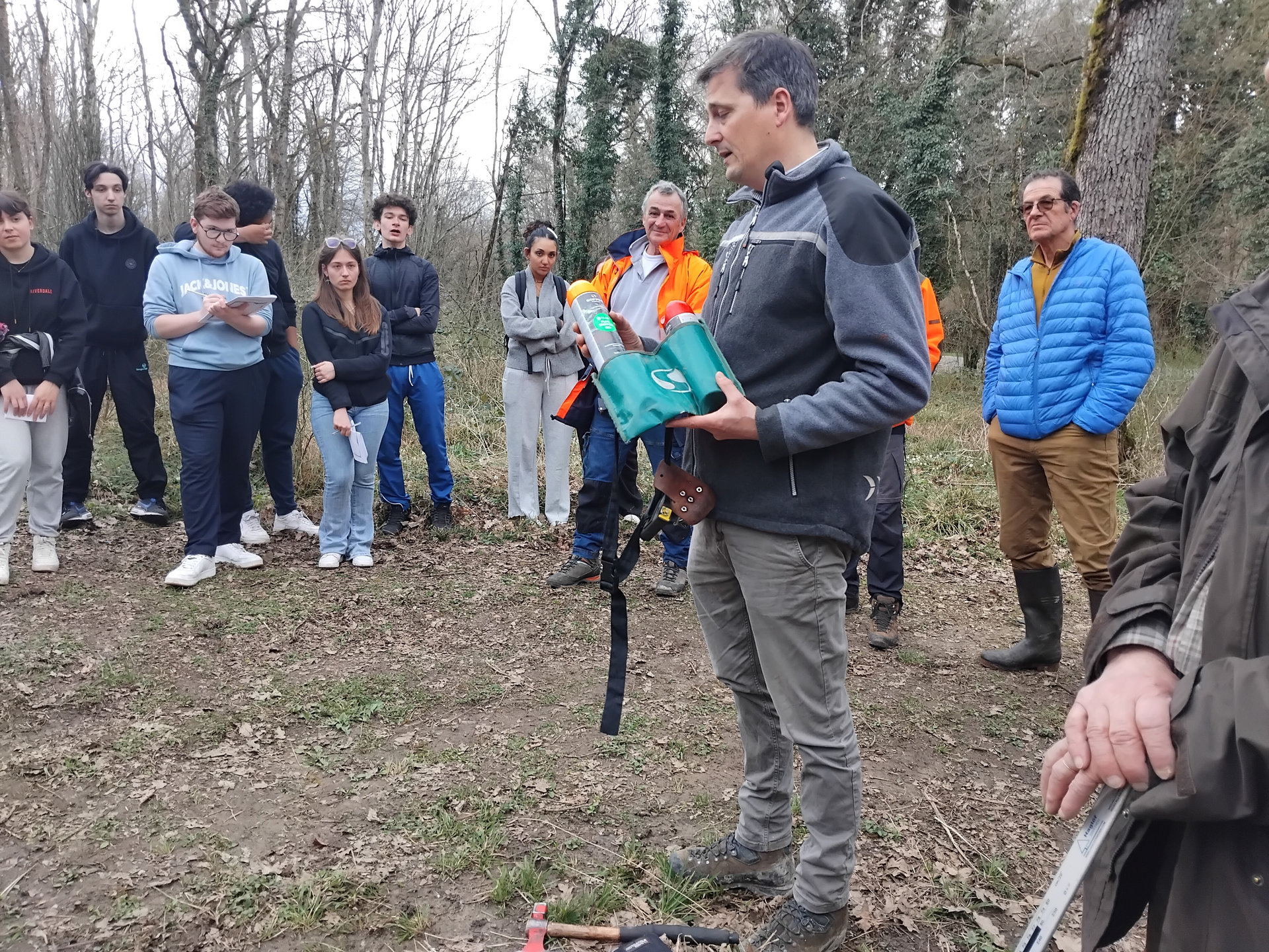 Le technicien, M Dutel a montrer aux élèves les outils utilisés dans son métier pour le marquage des arbres (marteau et bombes peinture), pour les mesures afin d’évaluer les volumes (télémètre et compas forestier). Il a ensuite présenté le métier de bucheron de manière détaillée.