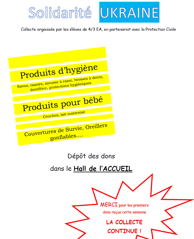 A l’initiative des élèves de 4è/3è de l’Enseignement Agricole, une collecte est organisée à l’ensemble scolaire LPCJP2 de Villemoirieu afin de venir en aide aux réfugiés ukrainiens.