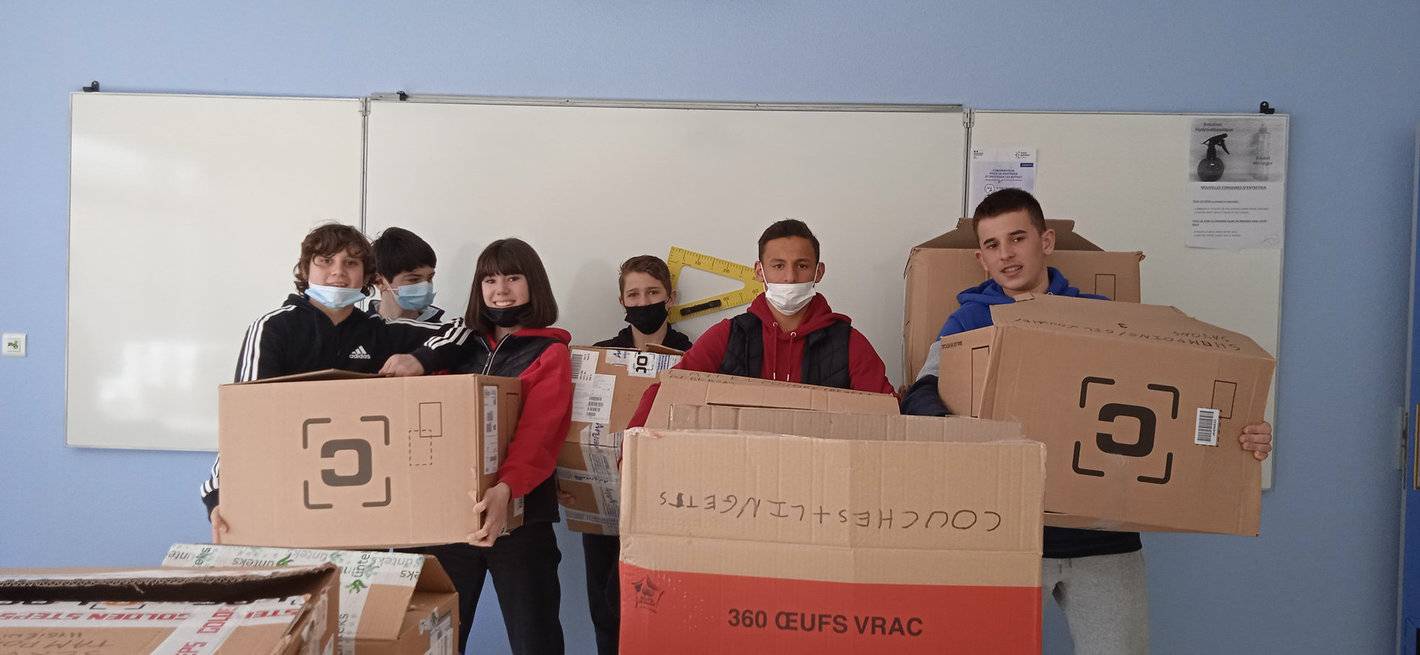Accompagnés par l’équipe éducative, ils mettent toute leur énergie pour que ce projet aboutisse : message d’informations aux familles et à l’ensemble des personnels, campagne d’affichage au sein de l’établissement. Les classes se relaient afin d’assurer le tri des produits collectés, la mise en carton, l’étiquetage.