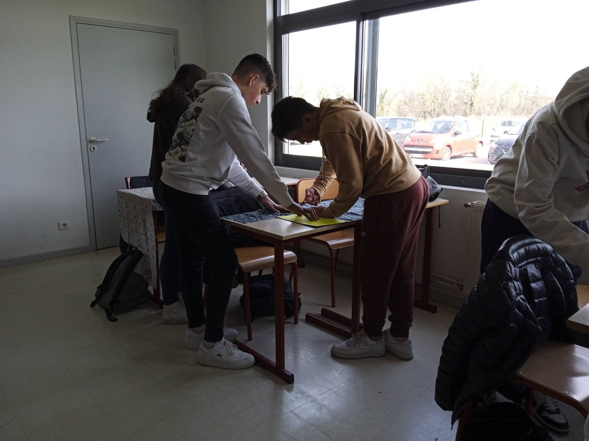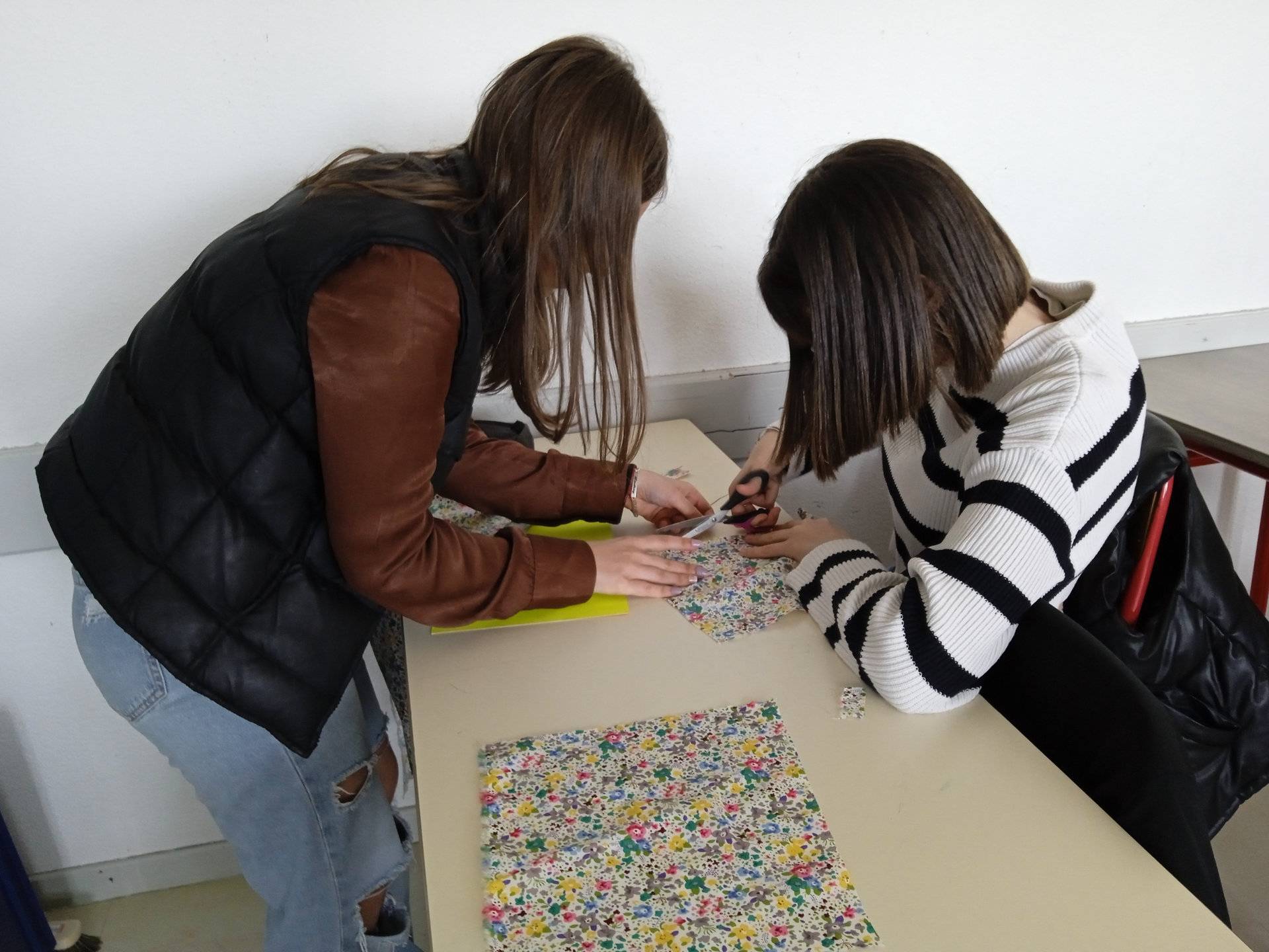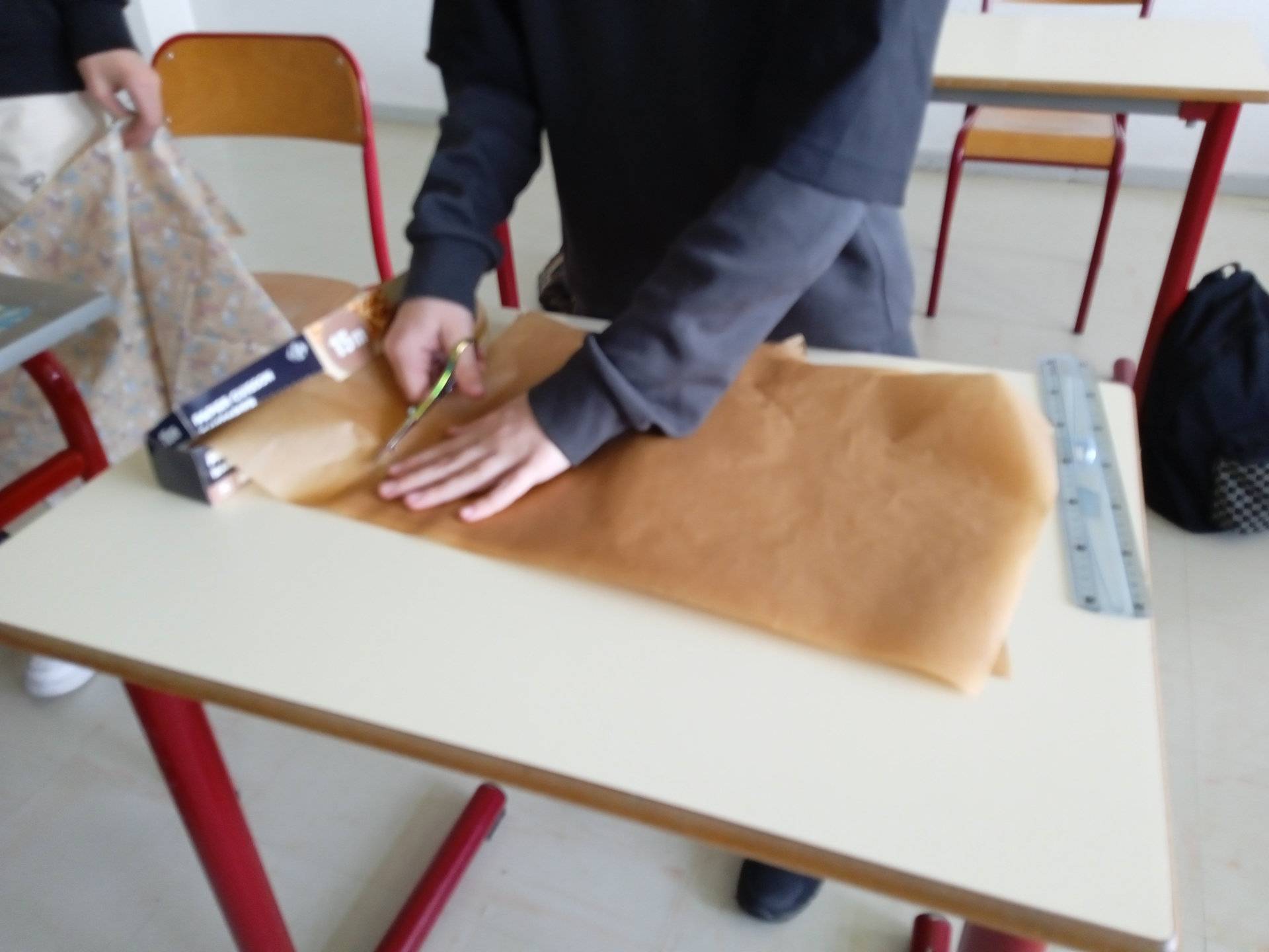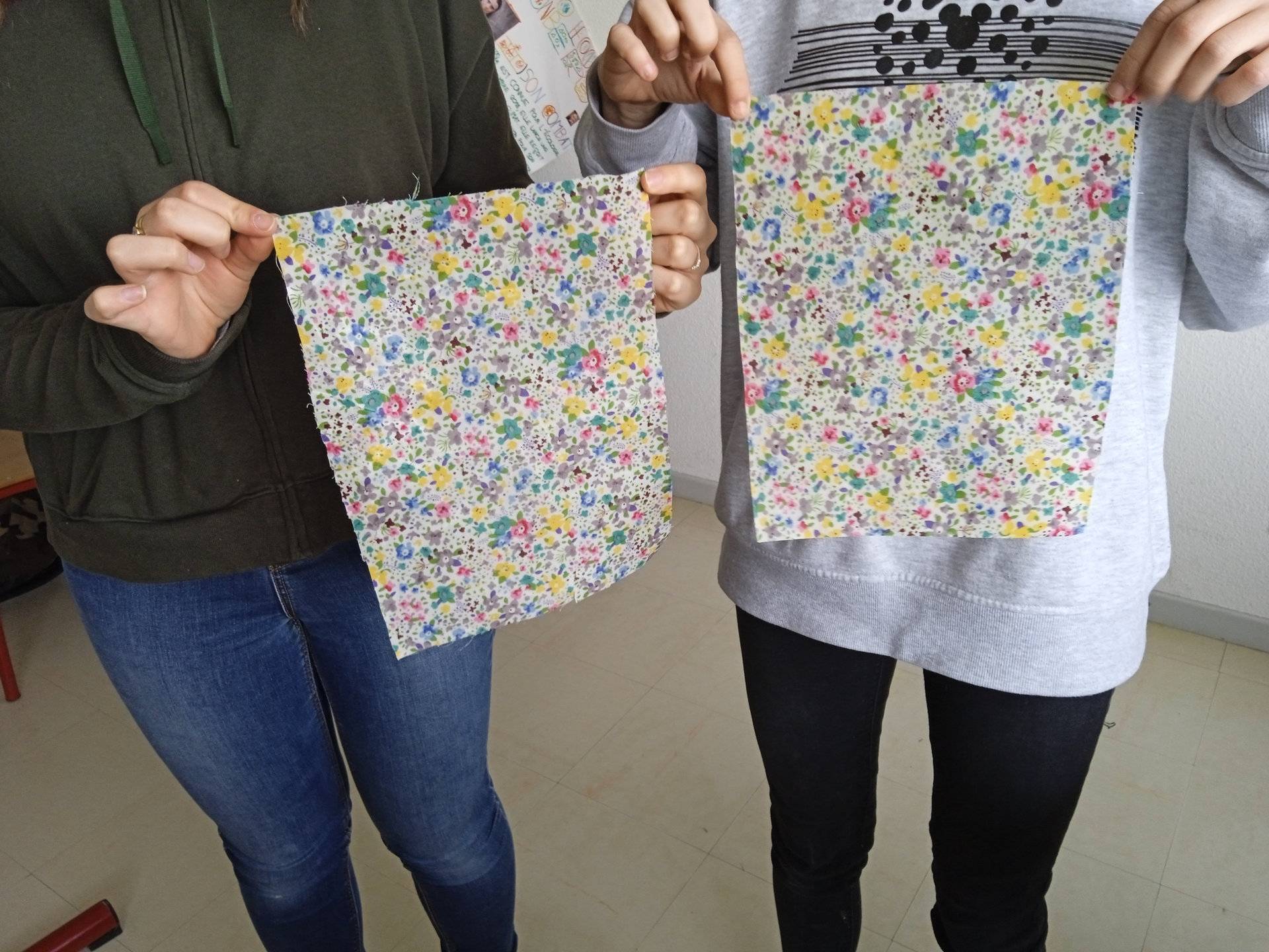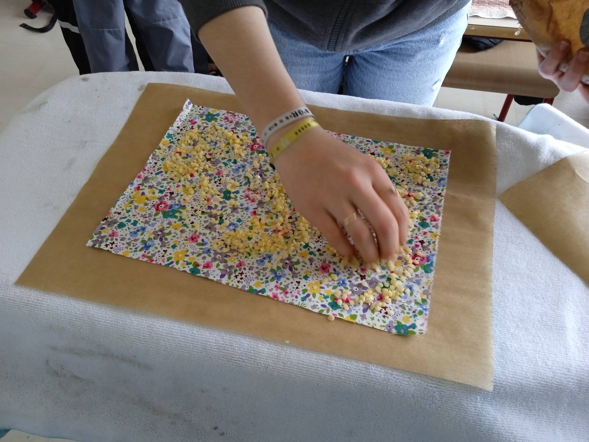 Les élèves ont tout d’abord choisi leur tissu et l’ont découpé en suivant un gabarit. Ils ont ensuite déposé le tissu sur du papier de cuisson puis ils ont déposé de la cire d’abeille dessus. L’ensemble est à nouveau recouvert d’un papier de cuisson puis passé au fer à repasser pour fondre la cire et imbiber le tissu.