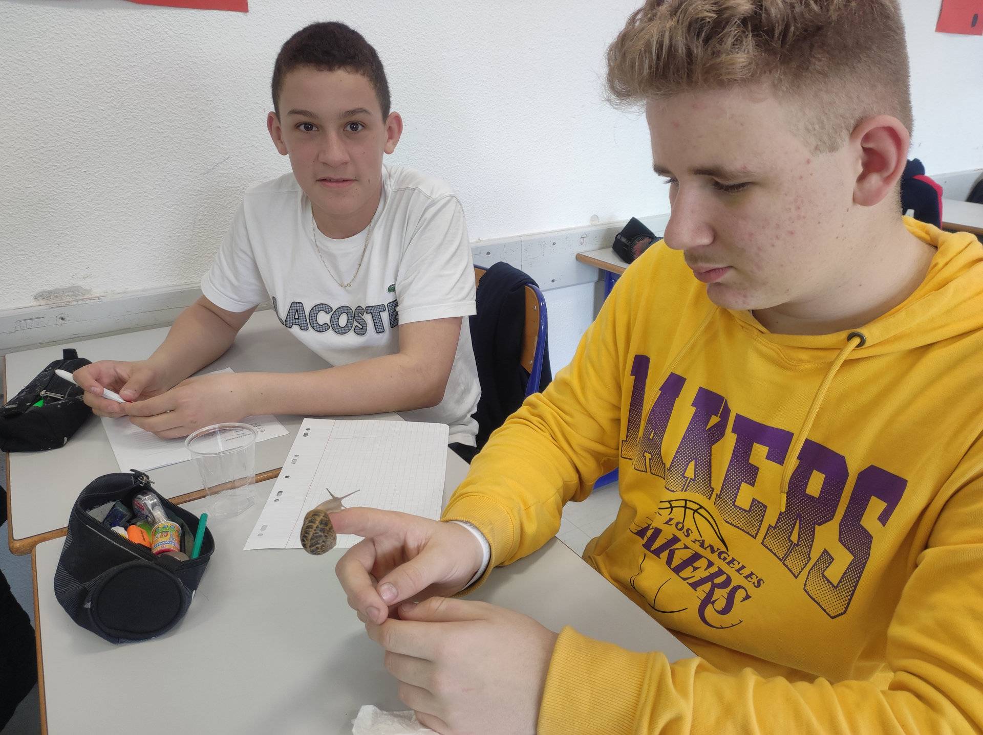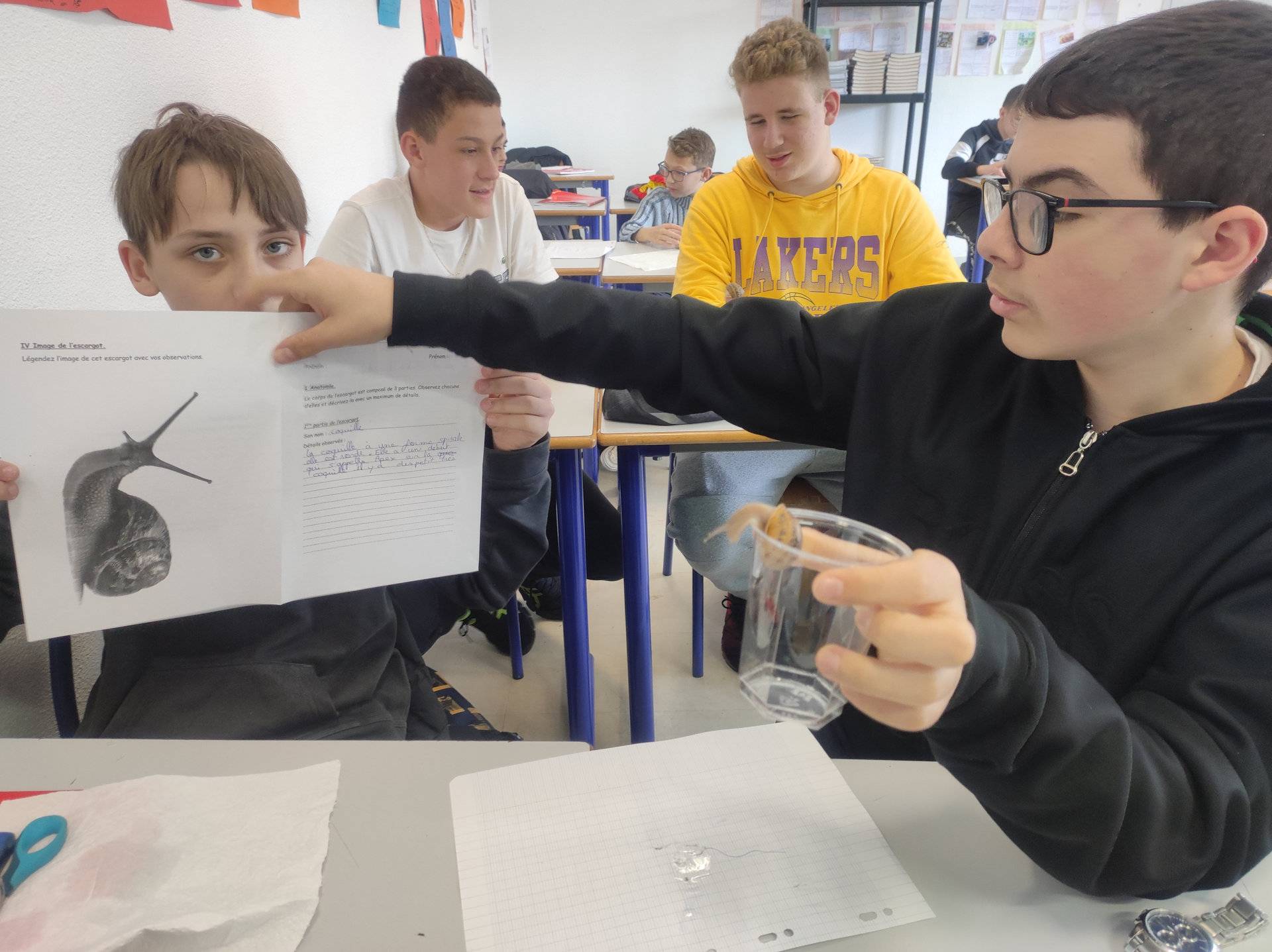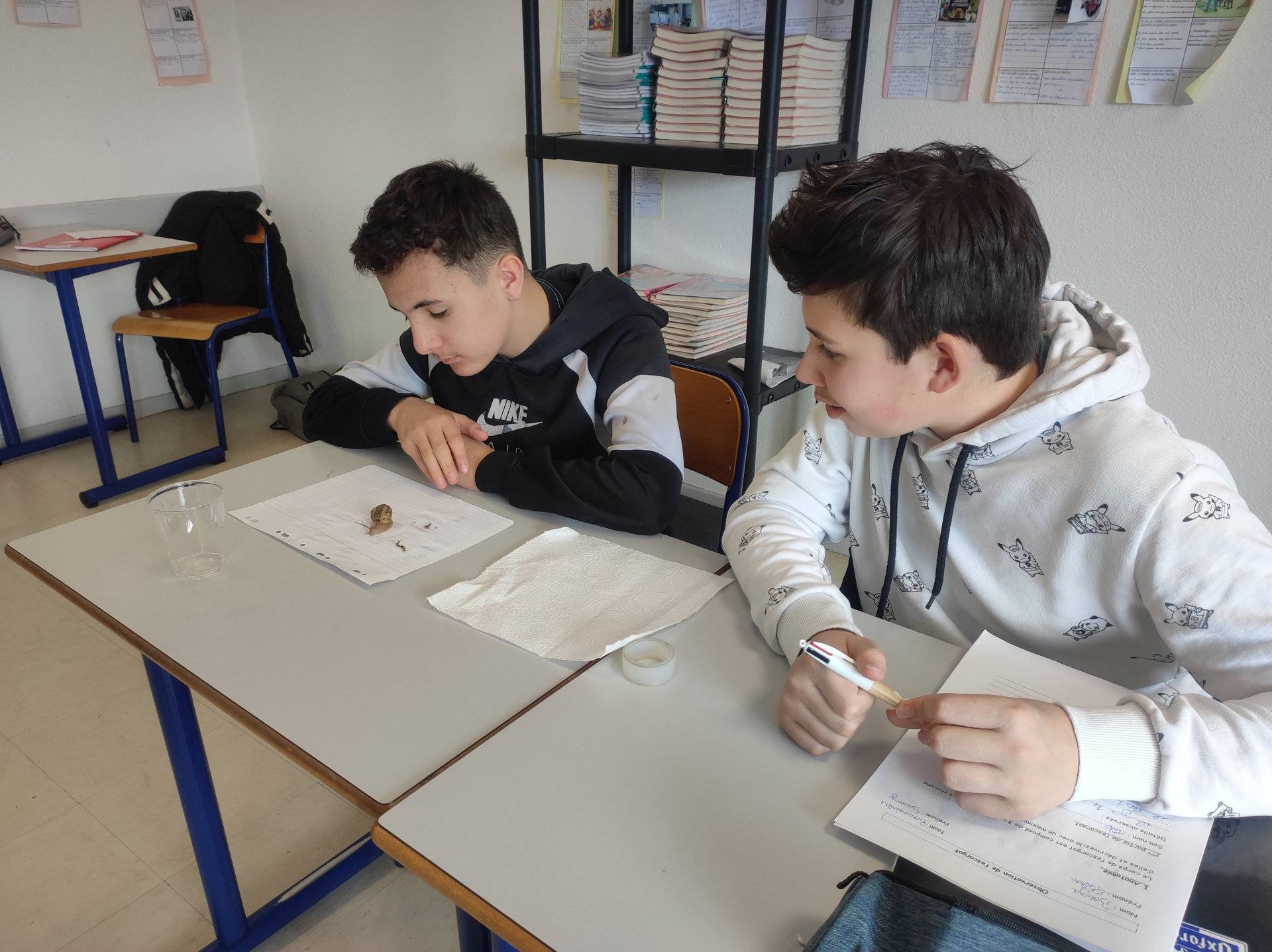 Dans le cadre du cours de thème animal, les deux classes de 4èmes Enseignement Agricole ont installé un vivarium où ils ont accueilli dix escargots petit-gris. En attendant que les reproducteurs pondent leurs œufs, nous avons réalisé une séance pour nous familiariser avec l’animal en étudiant son anatomie. Les élèves ont ainsi pu découvrir les différentes parties du mollusque avec une coquille présentant des stries de croissance, une tête équipée de quatre tentacules rétractiles ainsi que d’une bouche, l’orifice respiratoire, et le pied très baveux. Nous avons même pu assister à l’accouplement de deux d’entre eux. Nous attendons maintenant la ponte suivie de l’arrivée de petits escargots.