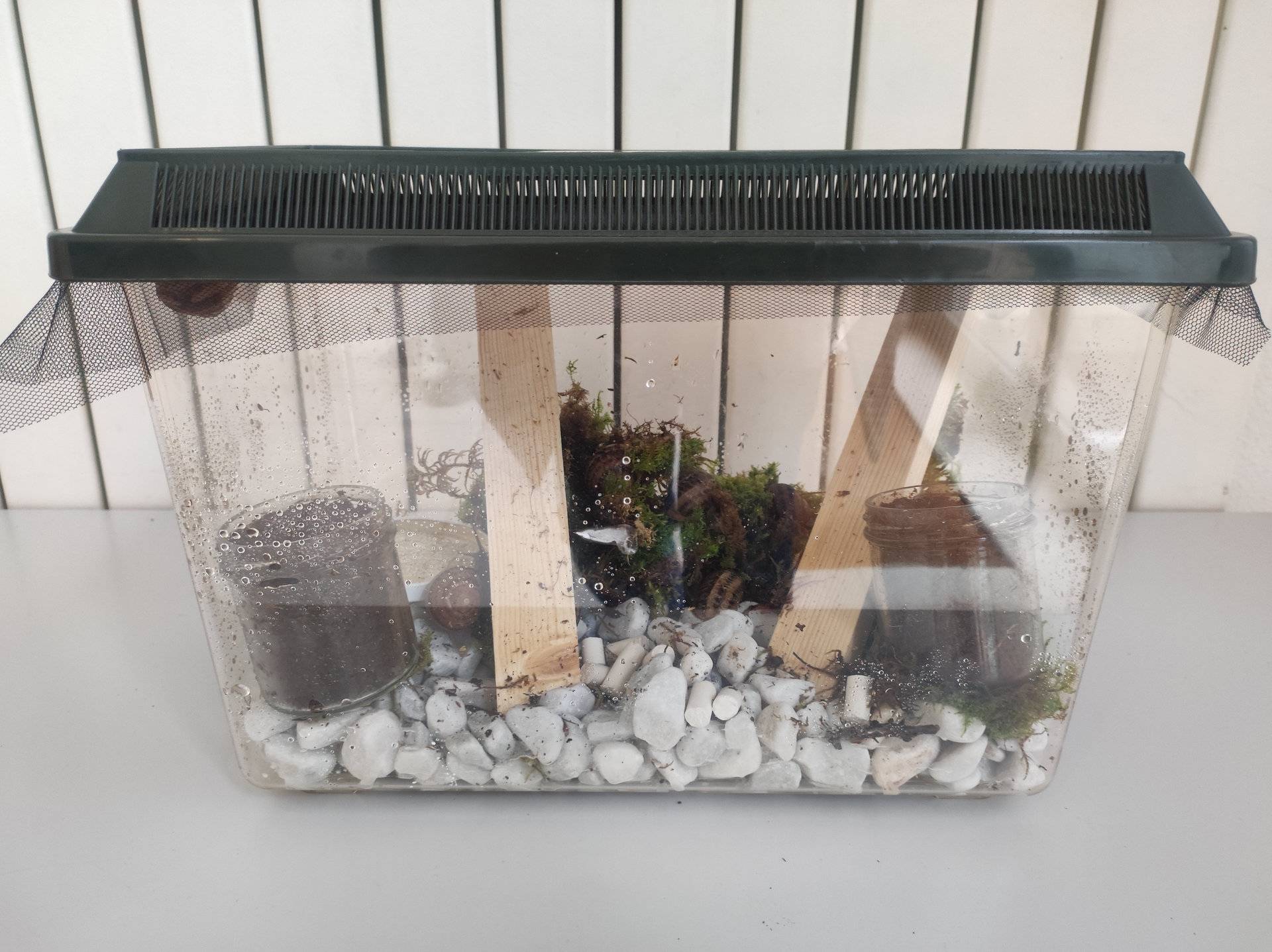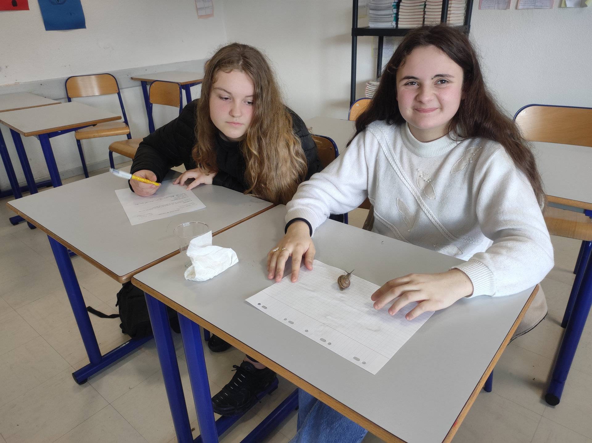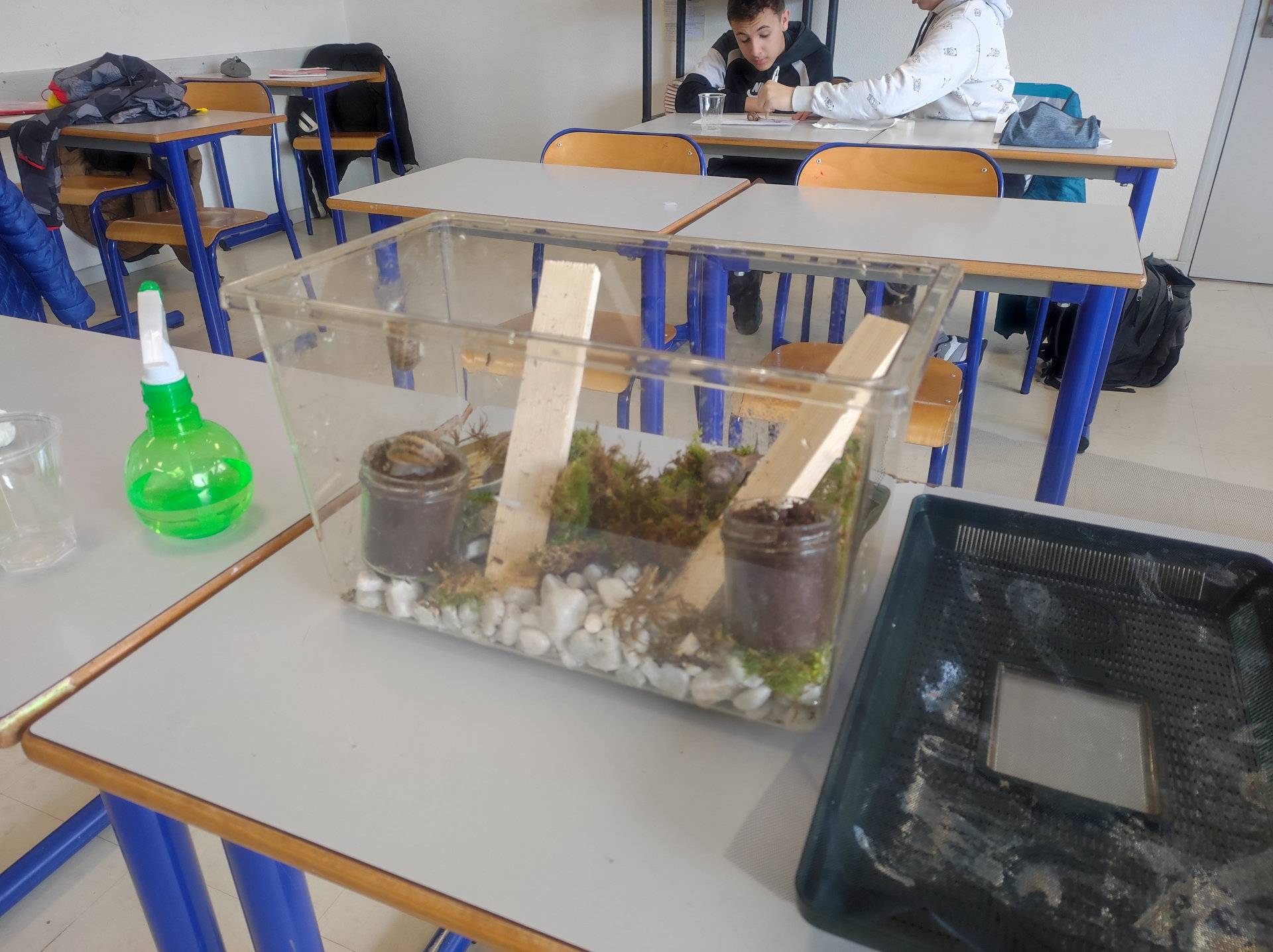 Dans le cadre du cours de thème animal, les deux classes de 4èmes Enseignement Agricole ont installé un vivarium où ils ont accueilli dix escargots petit-gris. En attendant que les reproducteurs pondent leurs œufs, nous avons réalisé une séance pour nous familiariser avec l’animal en étudiant son anatomie. Les élèves ont ainsi pu découvrir les différentes parties du mollusque avec une coquille présentant des stries de croissance, une tête équipée de quatre tentacules rétractiles ainsi que d’une bouche, l’orifice respiratoire, et le pied très baveux. Nous avons même pu assister à l’accouplement de deux d’entre eux. Nous attendons maintenant la ponte suivie de l’arrivée de petits escargots.