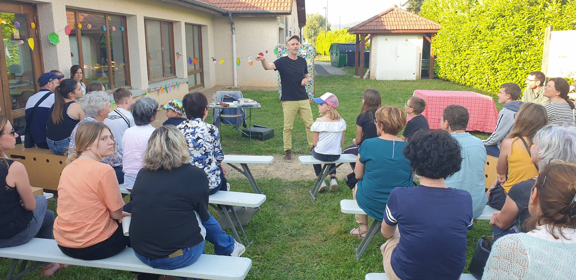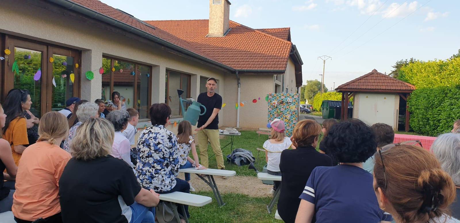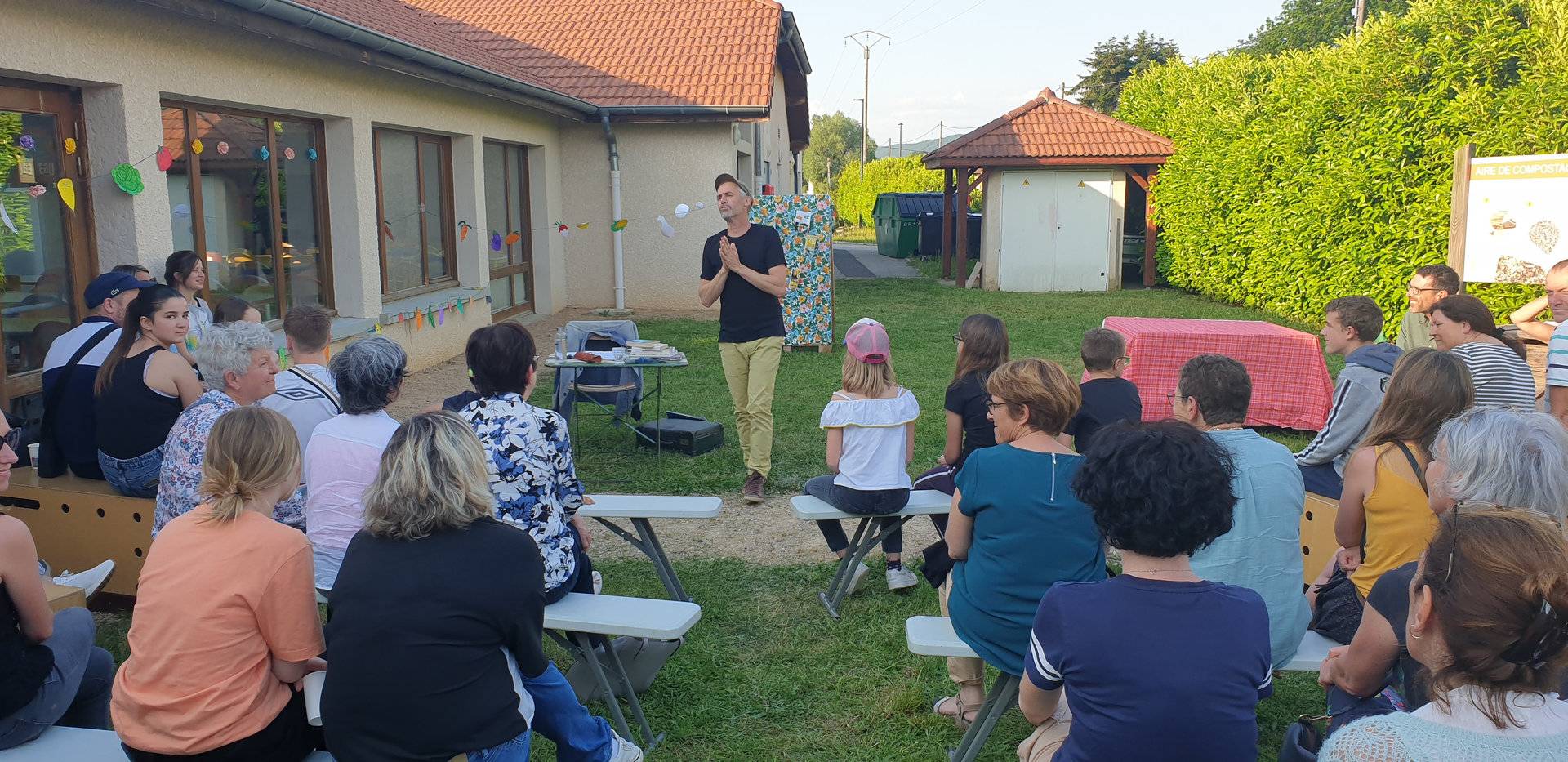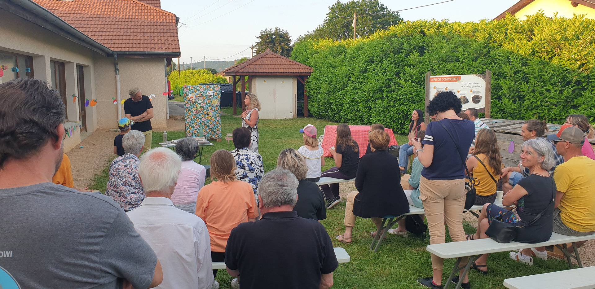 Les participants étaient nombreux: parents, élèves, enseignants, équipe de direction, membre du conseil de développement des balcons du Dauphiné, membres de la fête des possibles, acteurs de la gestion des déchets, voisins... La soirée a été très agréable, le soleil au rendez-vous, les échanges conviviaux, le spectacle amusant et poétique, les gourmandises délicieuses et fraîches.