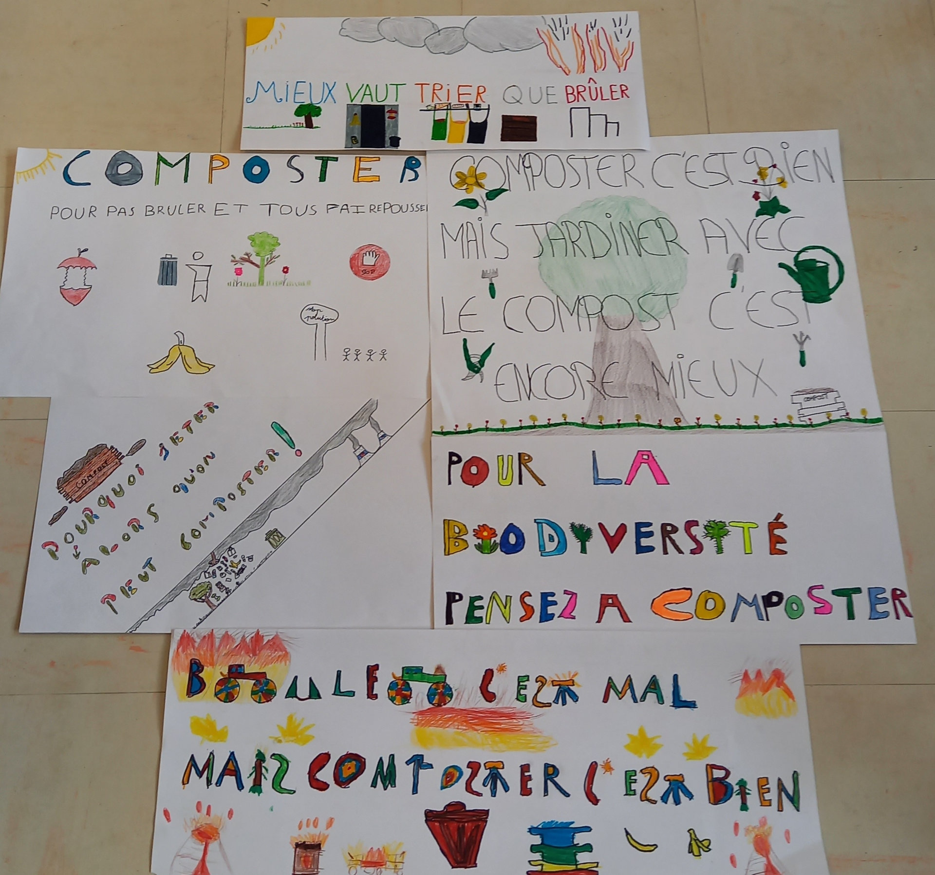 Les élèves de 4 EA ont réalisé des slogans en lien avec le tri au restaurant scolaire, le compostage des restes de repas, le gaspillage alimentaire et le jardinage.