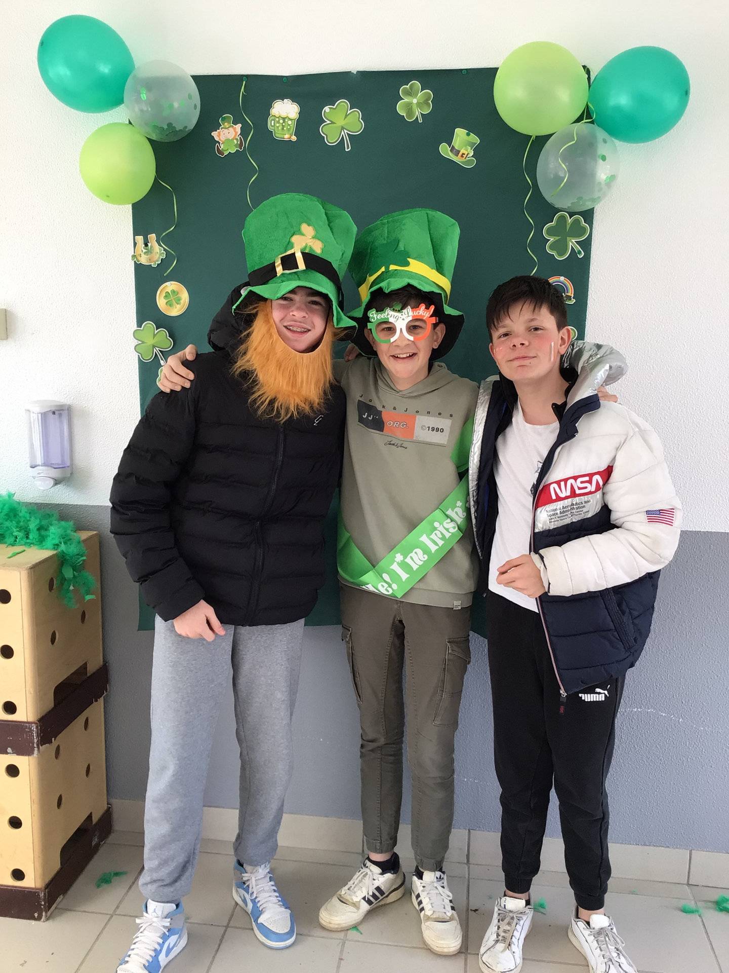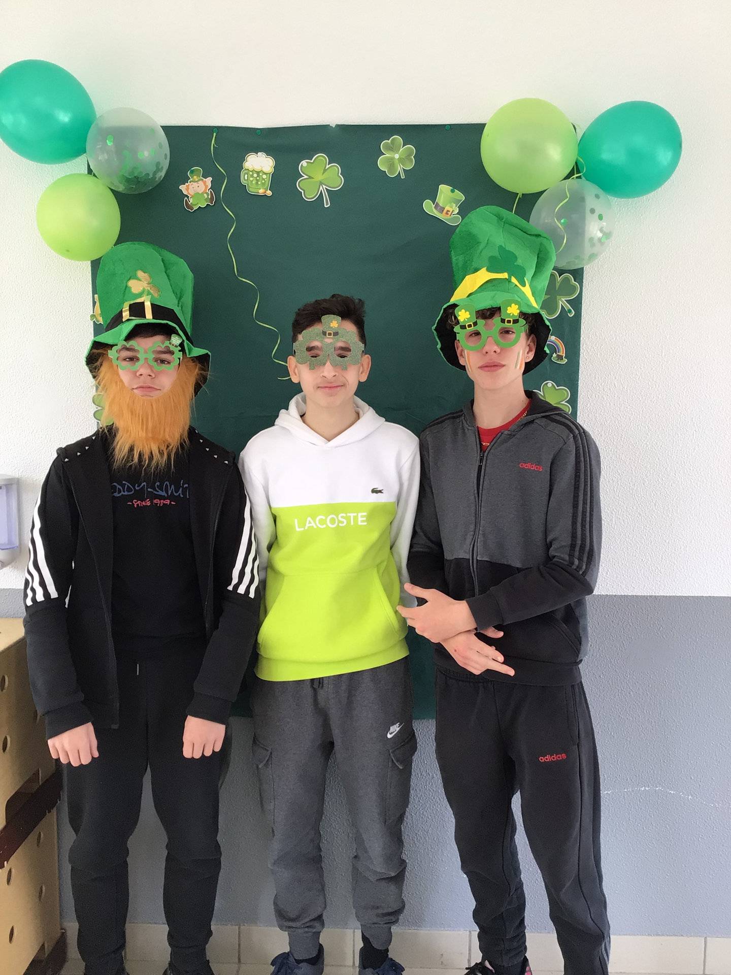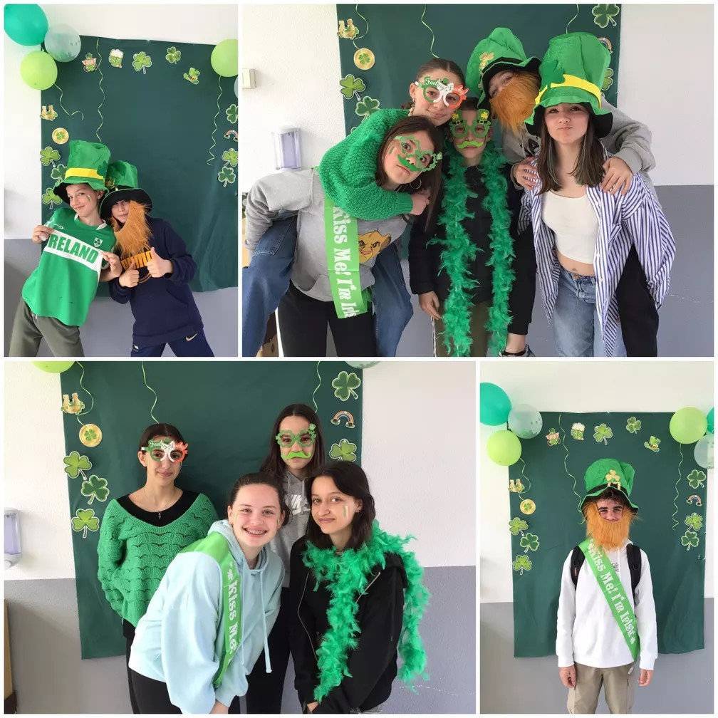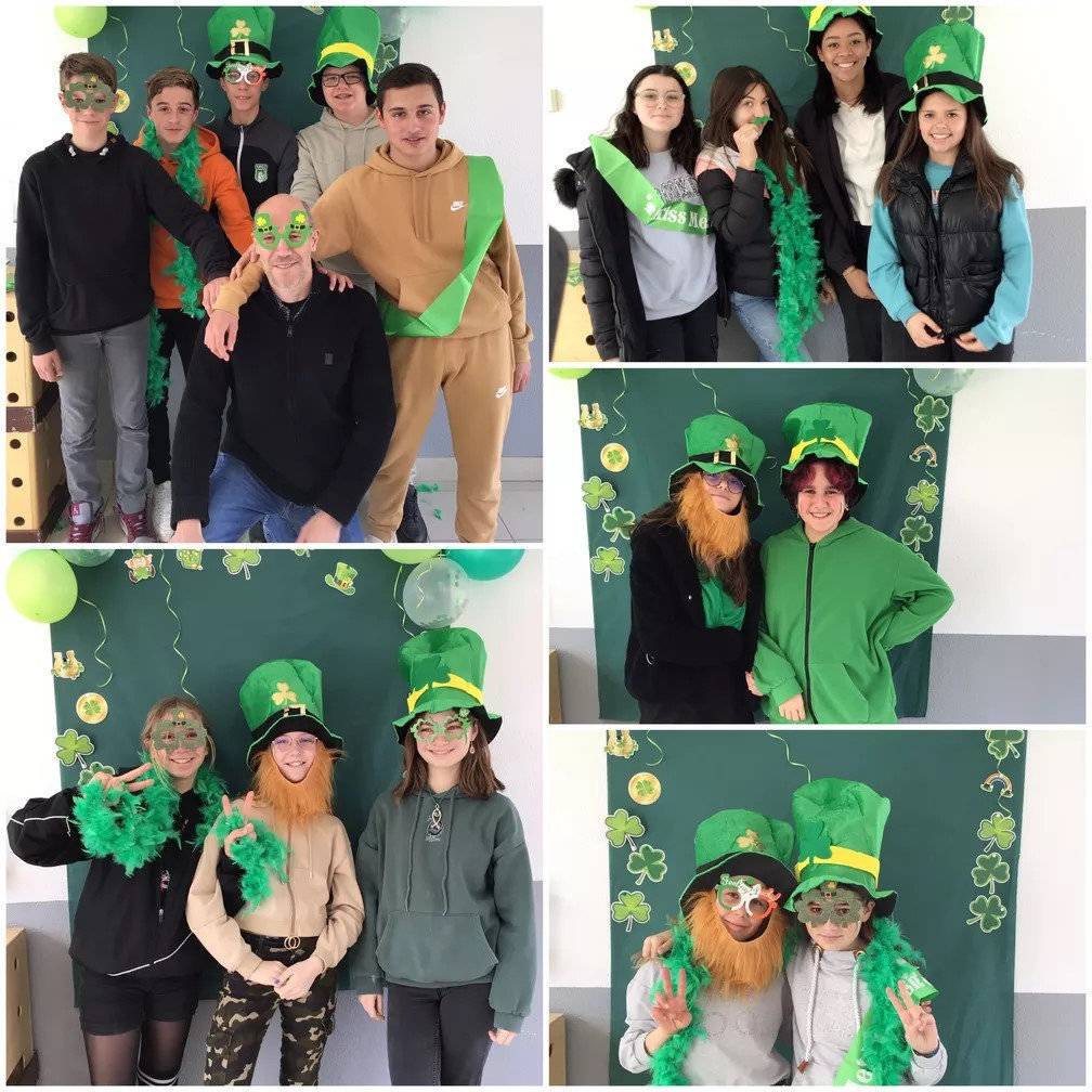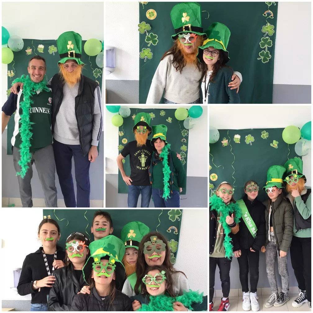 Repas irlandais à la cantine, photos dans la cour avec accessoires.