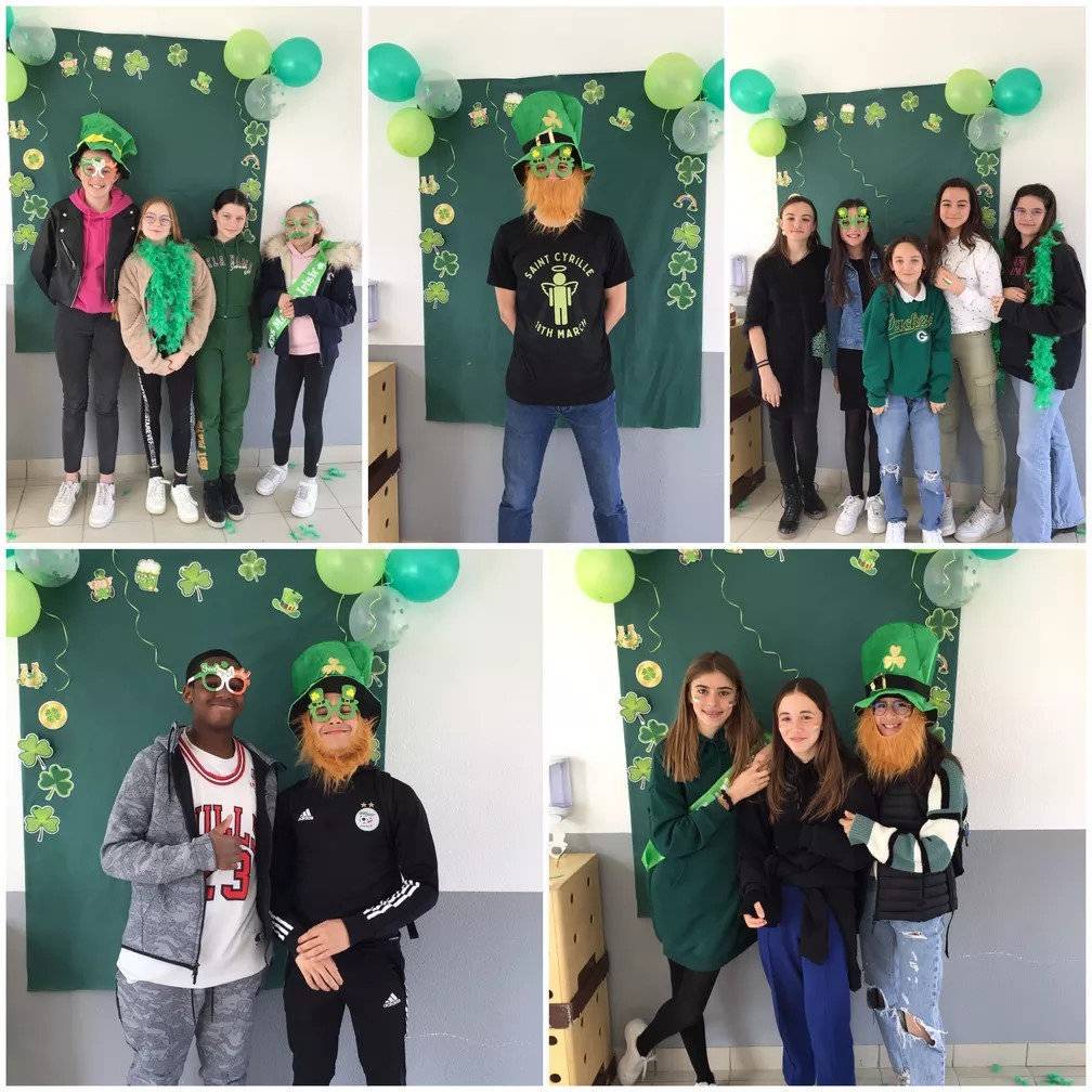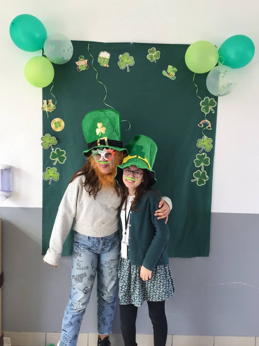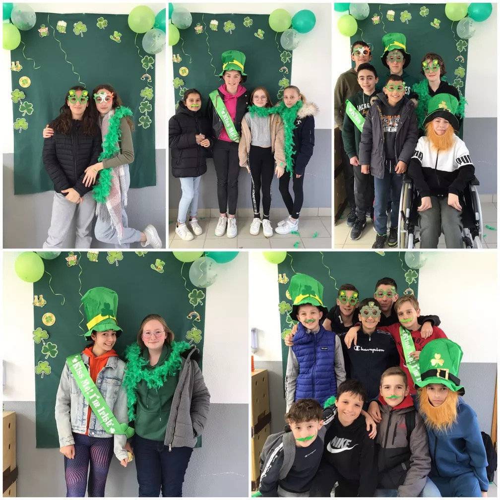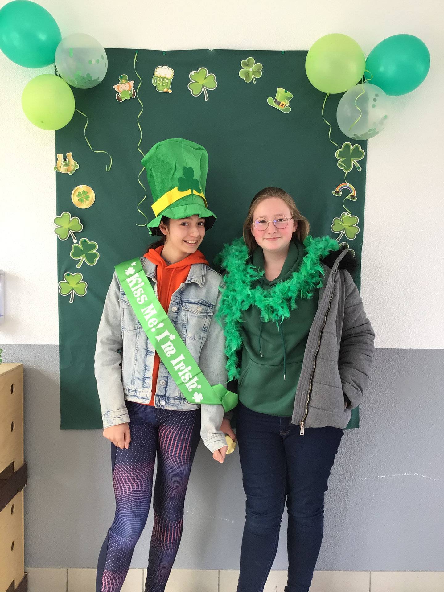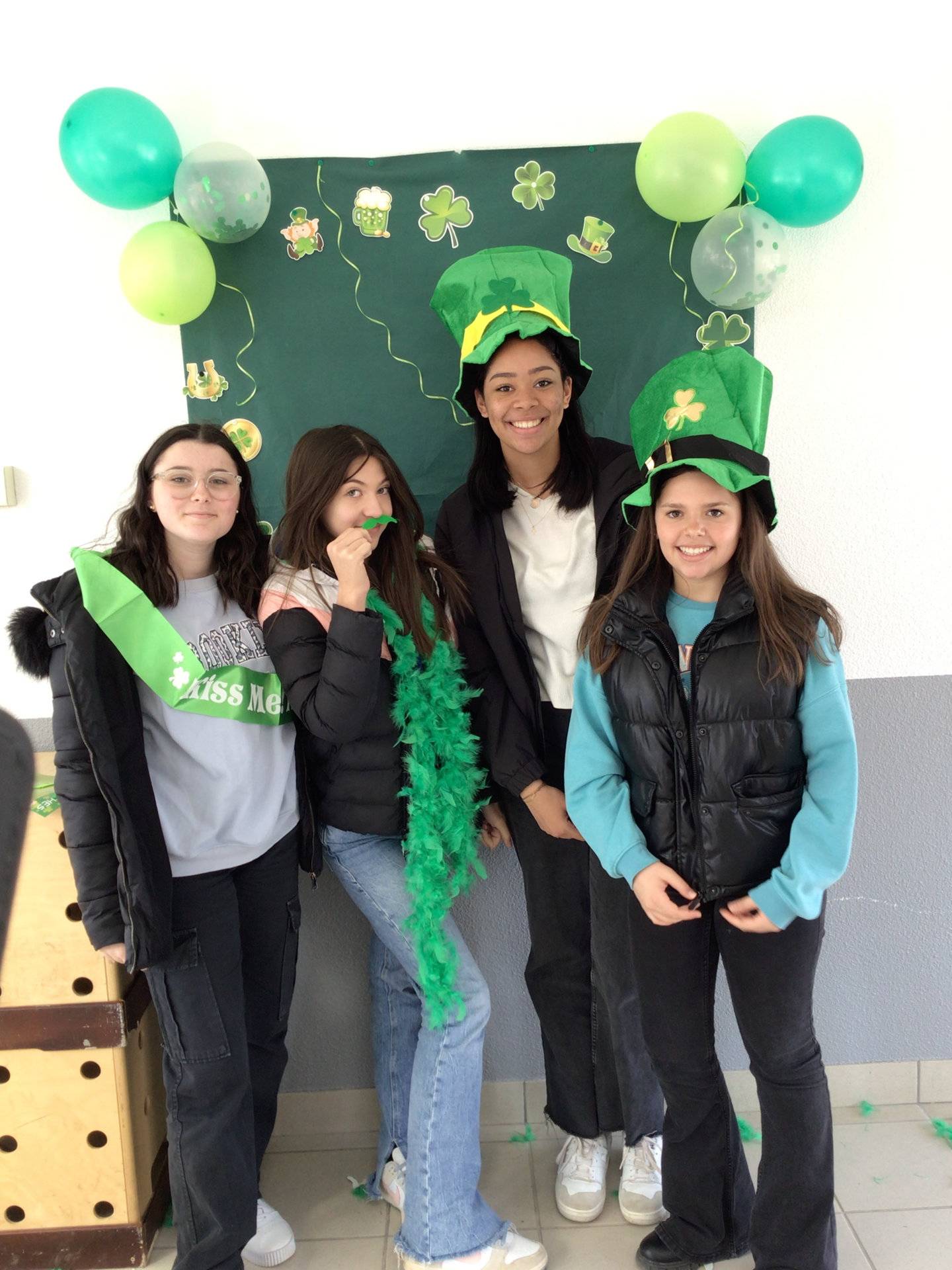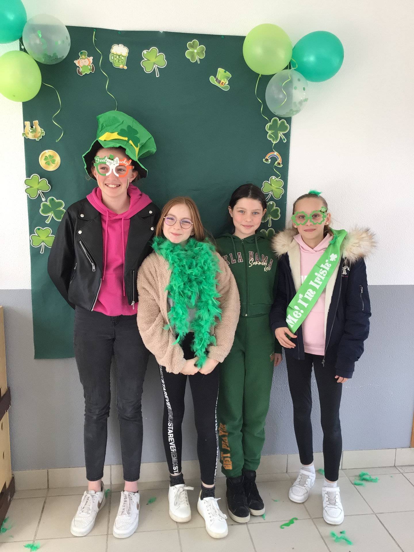 Repas irlandais à la cantine, photos dans la cour avec accessoires.