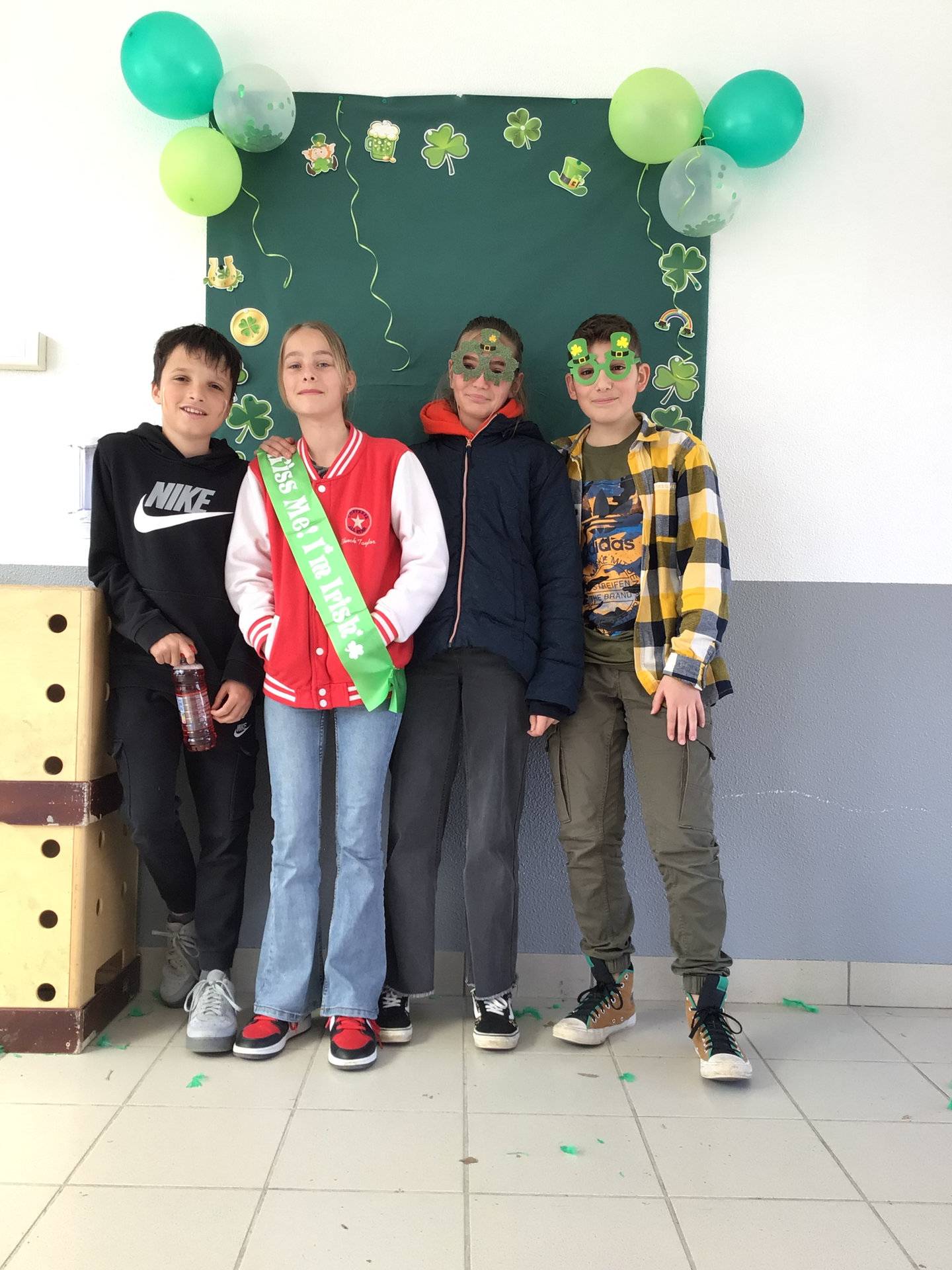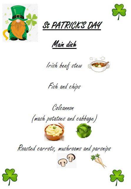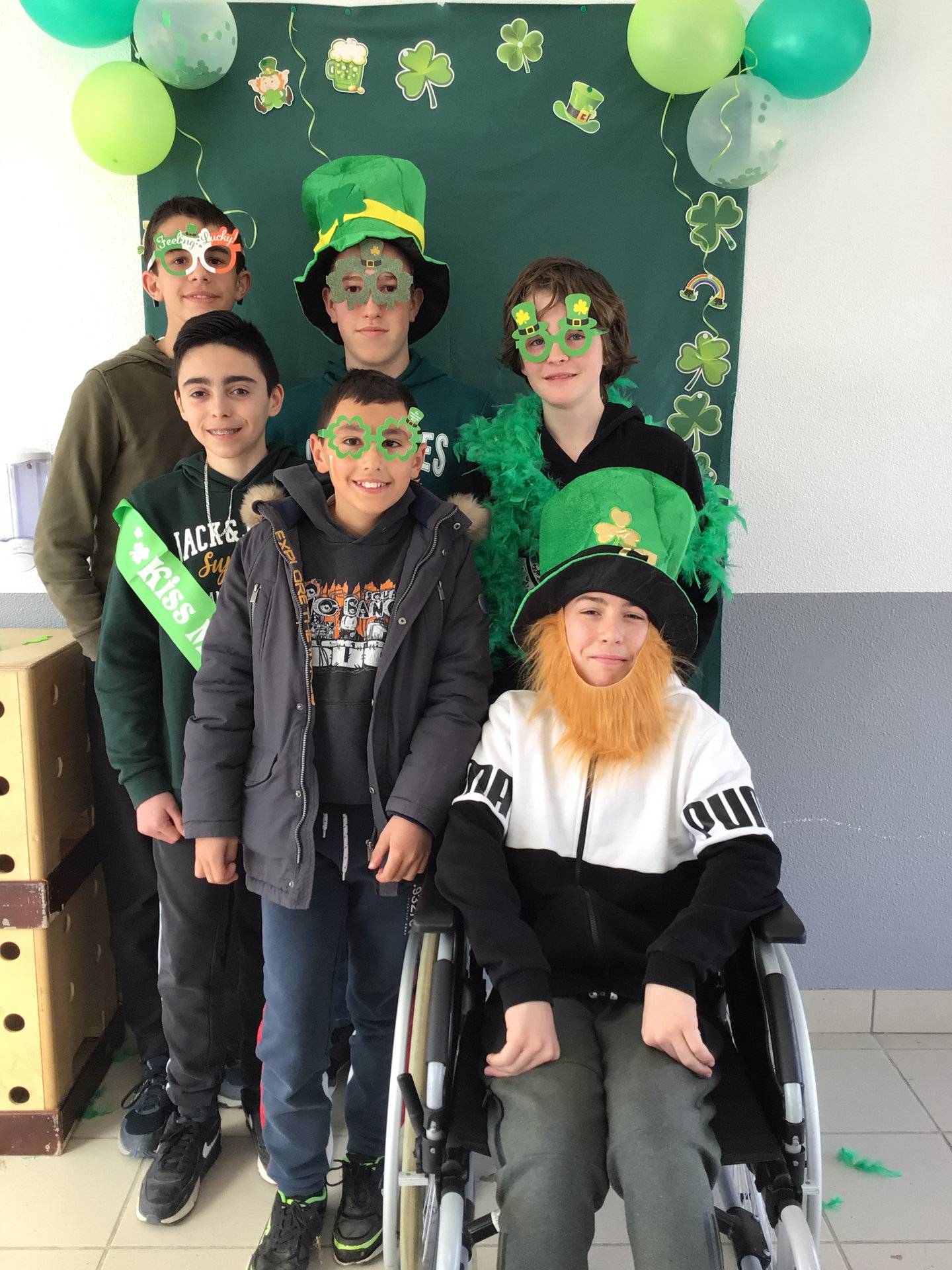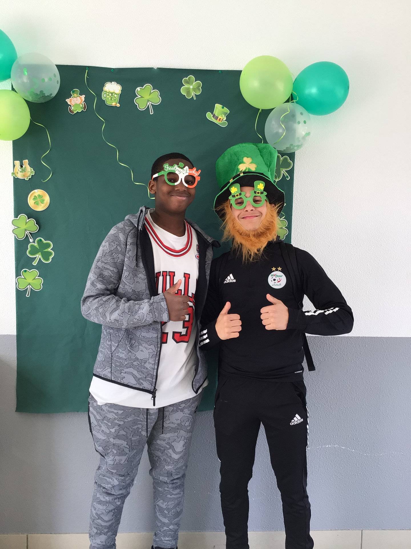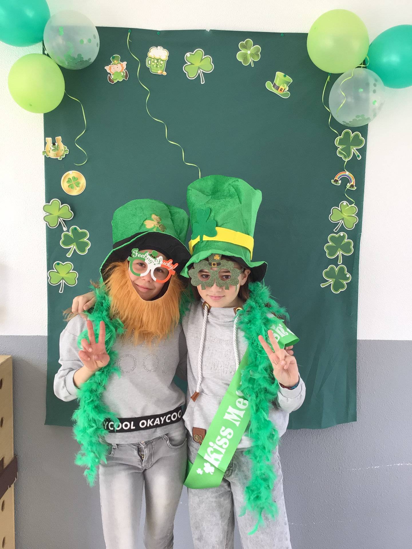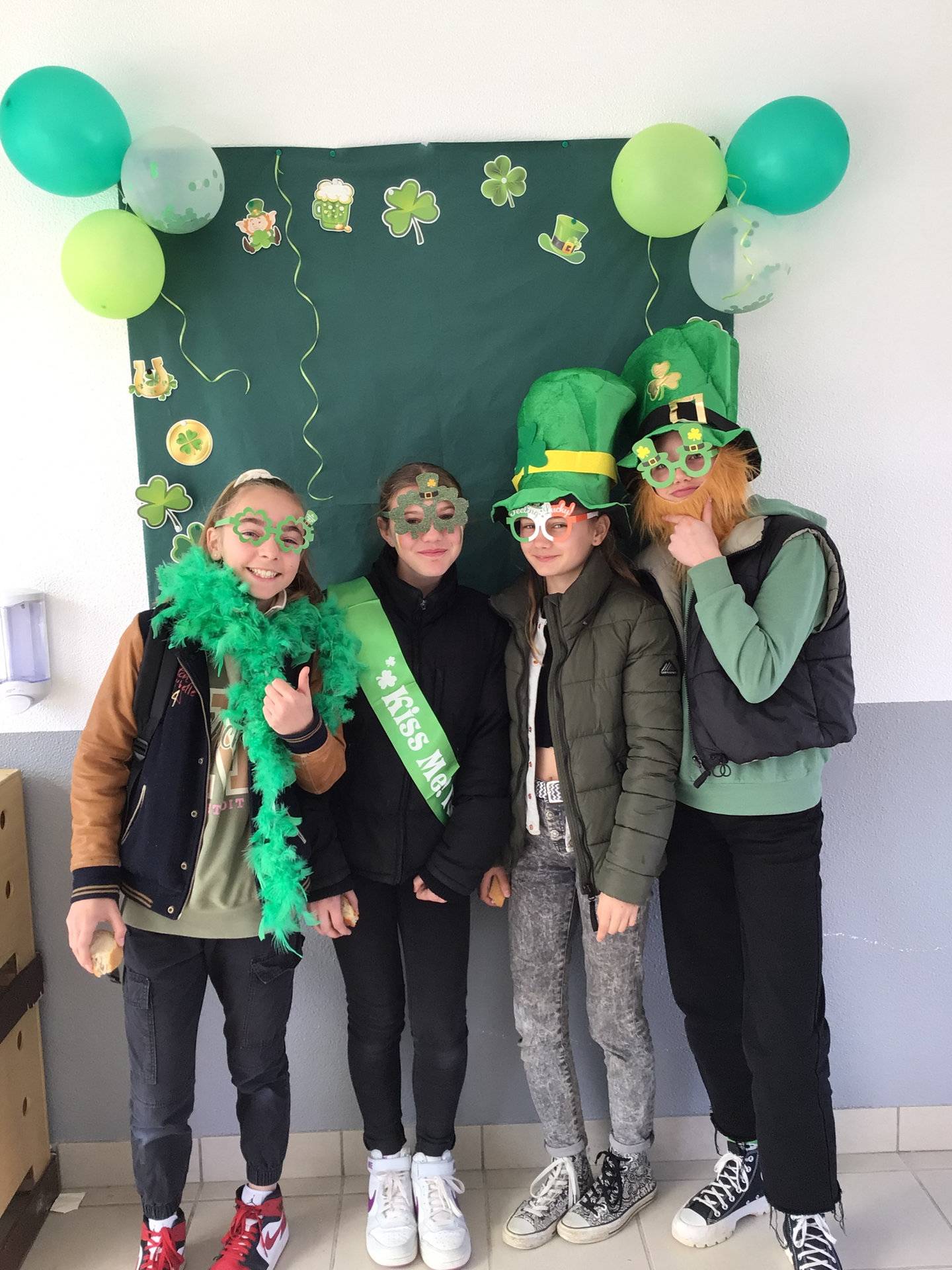 Repas irlandais à la cantine, photos dans la cour avec accessoires.