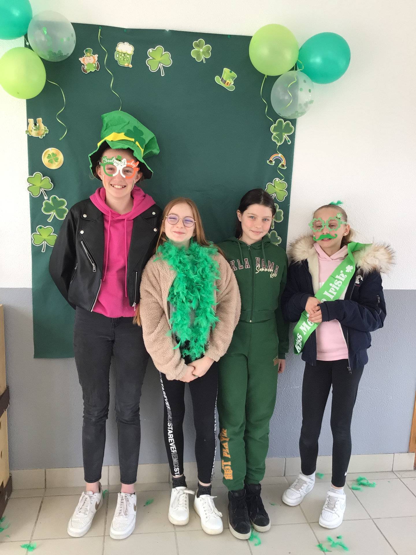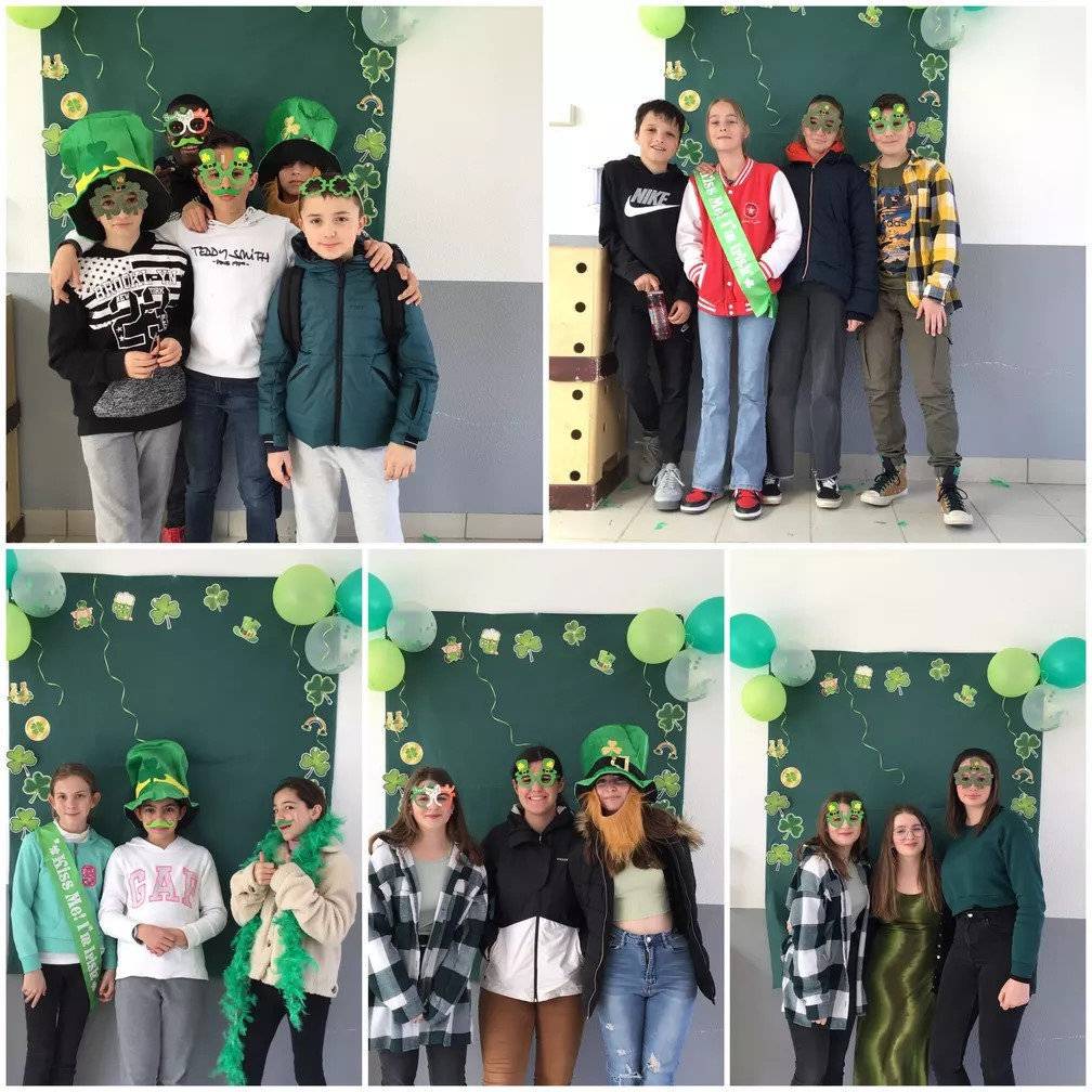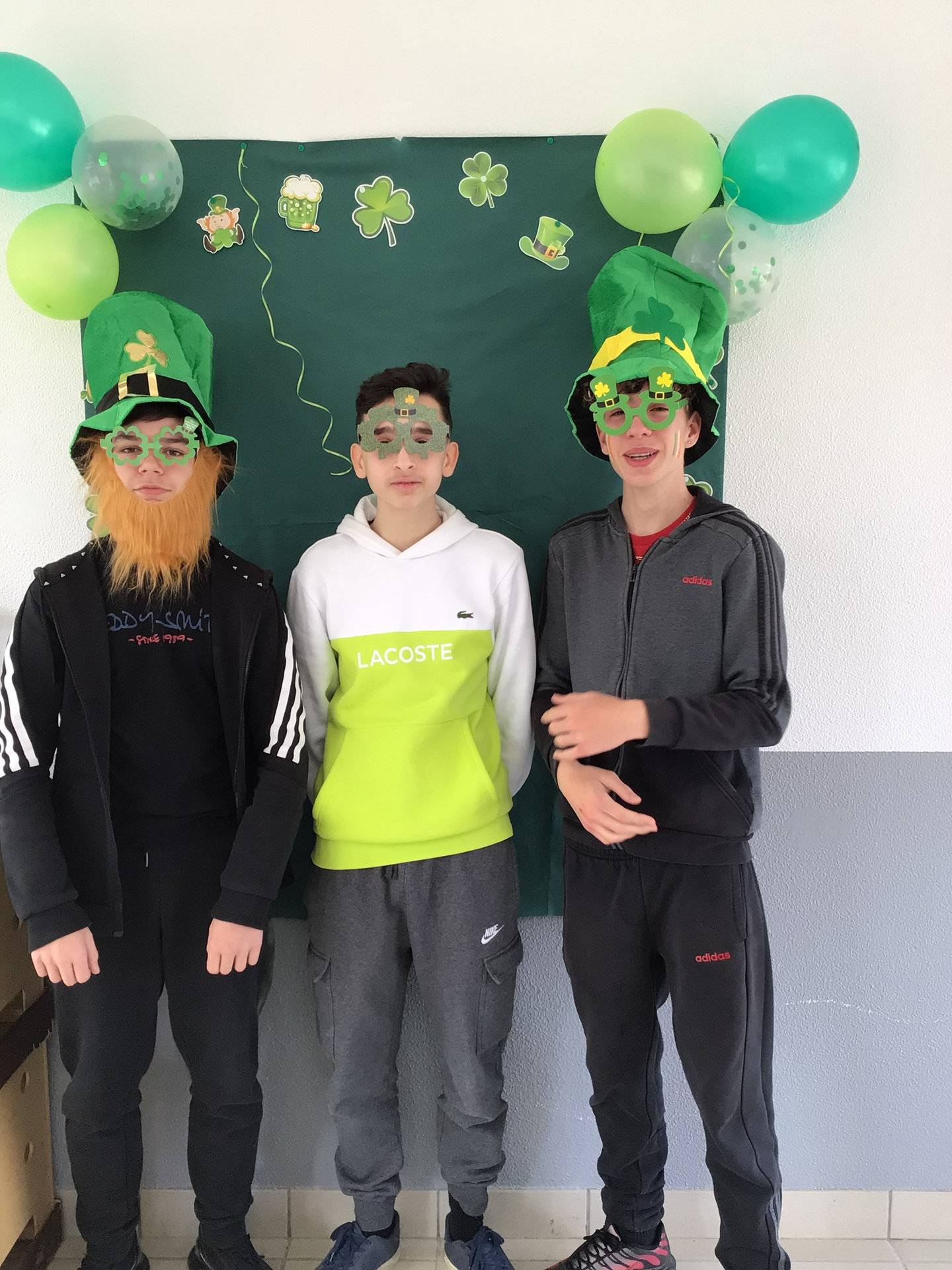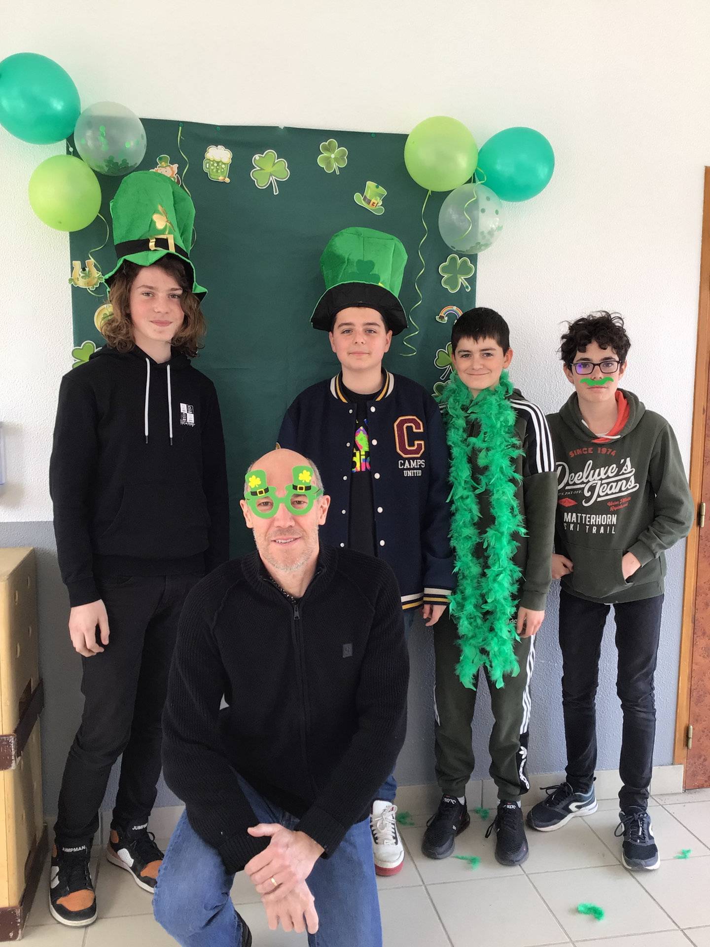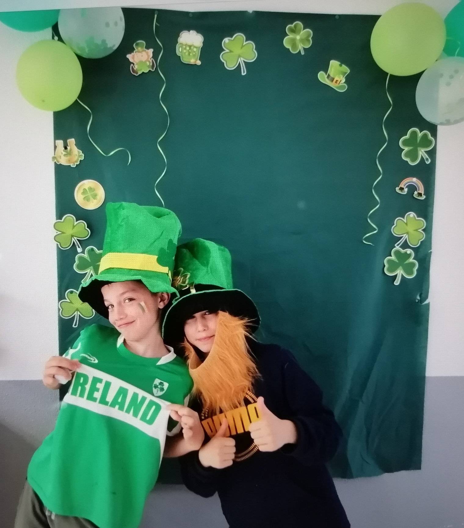 Repas irlandais à la cantine, photos dans la cour avec accessoires.