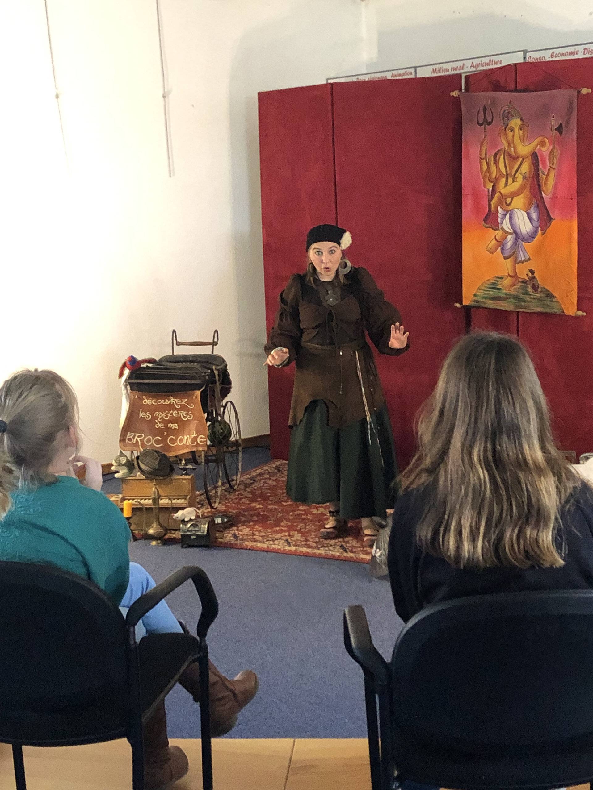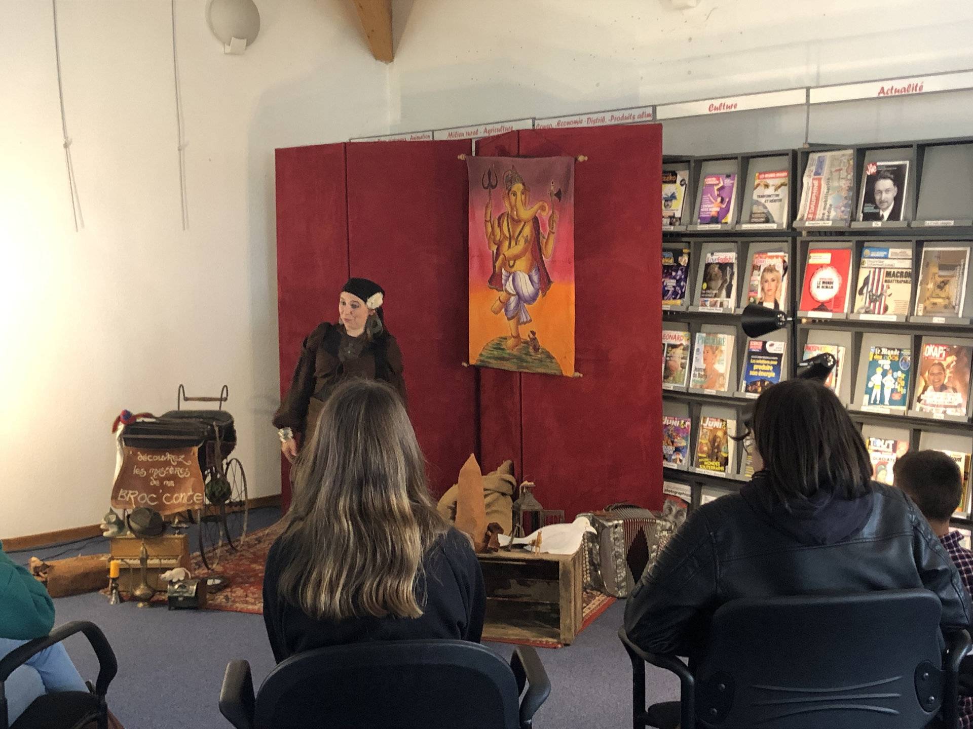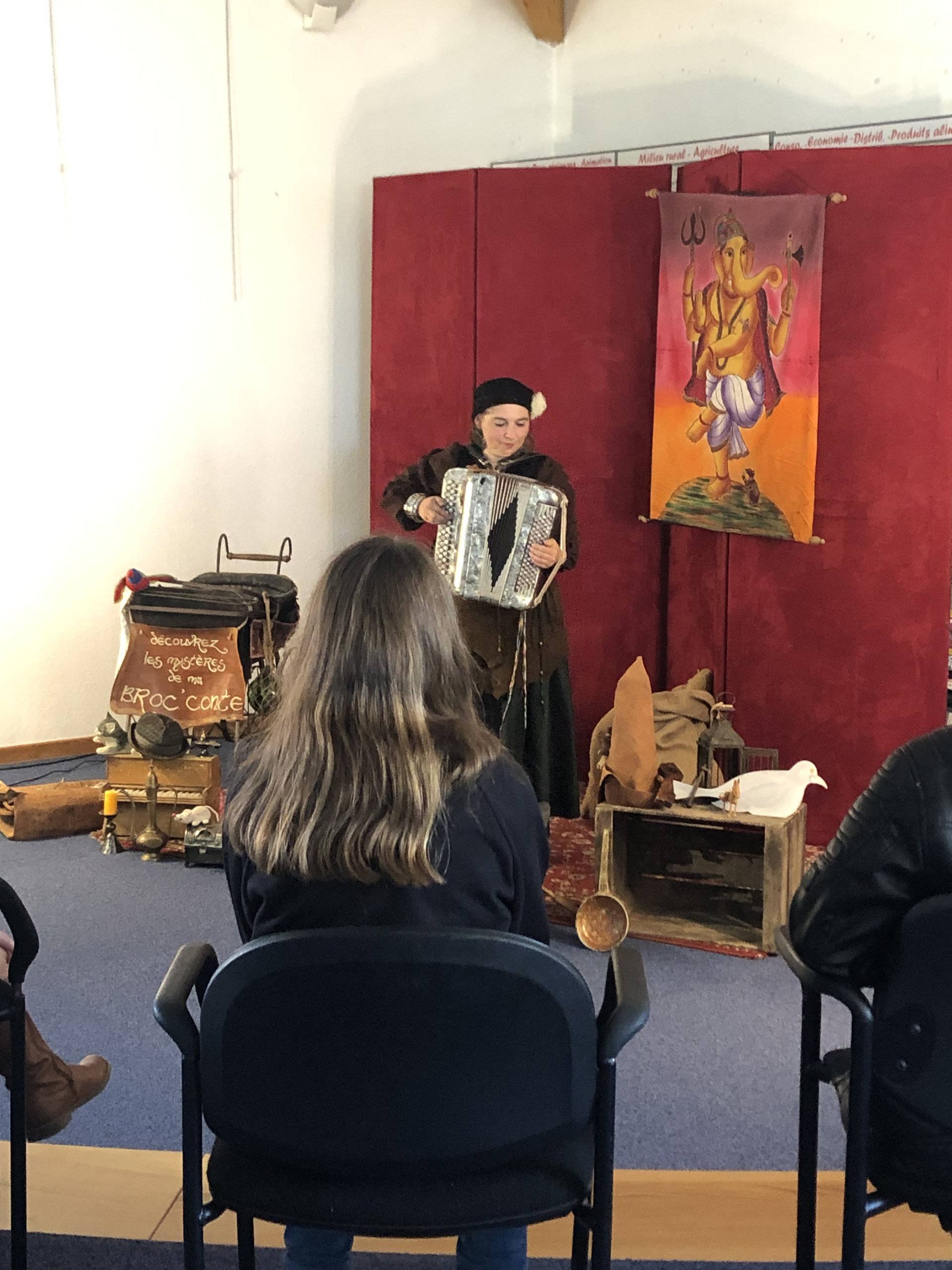 Mardi dernier nous avons reçu Jocelyne Merle, Conteuse, accordéoniste, et chanteuse. Et je tenais à remercier le personnel du CDI et tout nos collègues qui sont venus assister à son spectacle de BROC'CONTE. Un bric à brac d'objets contant des histoires de tous les continents. Un spectacle participatif ou un petit groupe d'élèves se sont plaisamment pris au jeu.