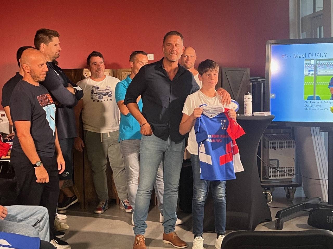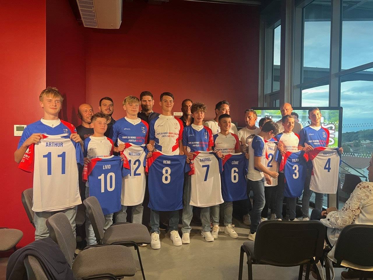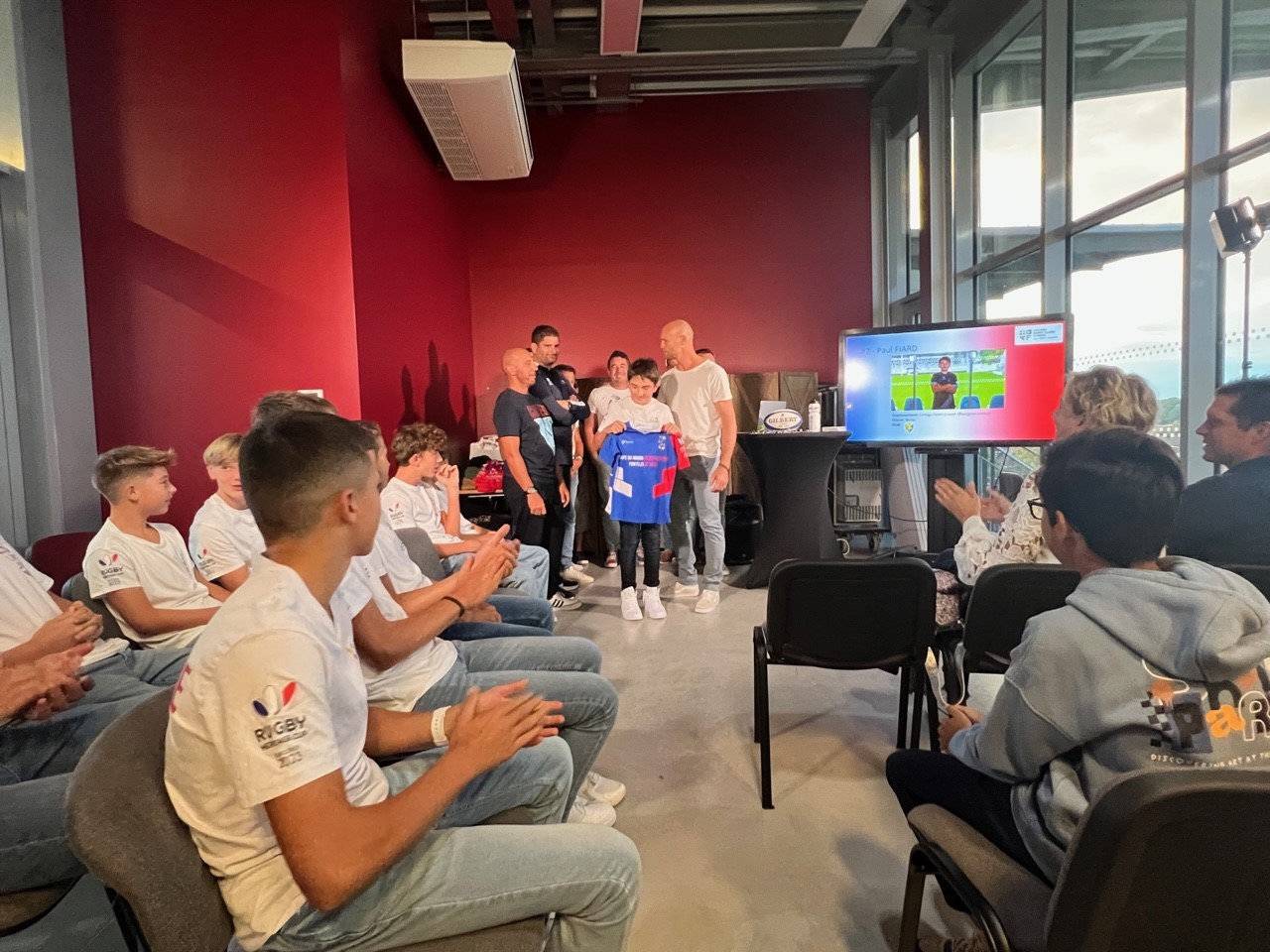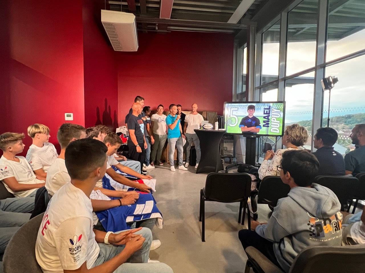 Avant le départ, dans les loges du stade Pierre Rajon, notre équipe s'est vu remettre leurs maillots de match et leur dotation par: