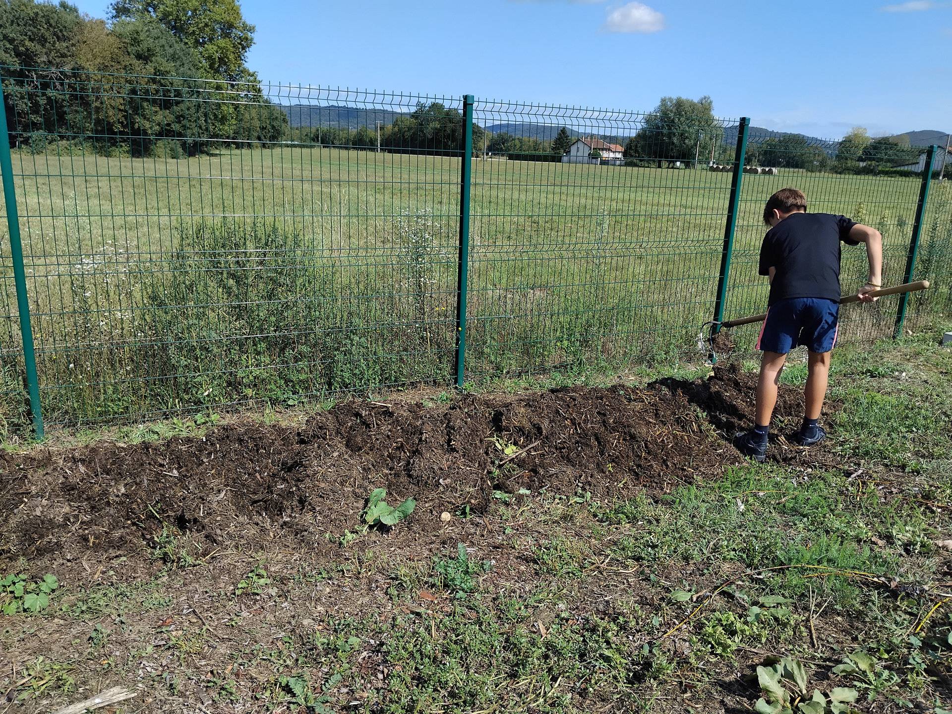 Compostage des restes de repas, transfert, tamisage avant un retour au sol du compost pour un jardinage au naturel. Ils font de même avec les tontes de pelouse qu'ils aèrent plusieurs fois par semaine grâce à l'ajout de paille et des copeaux de bois.