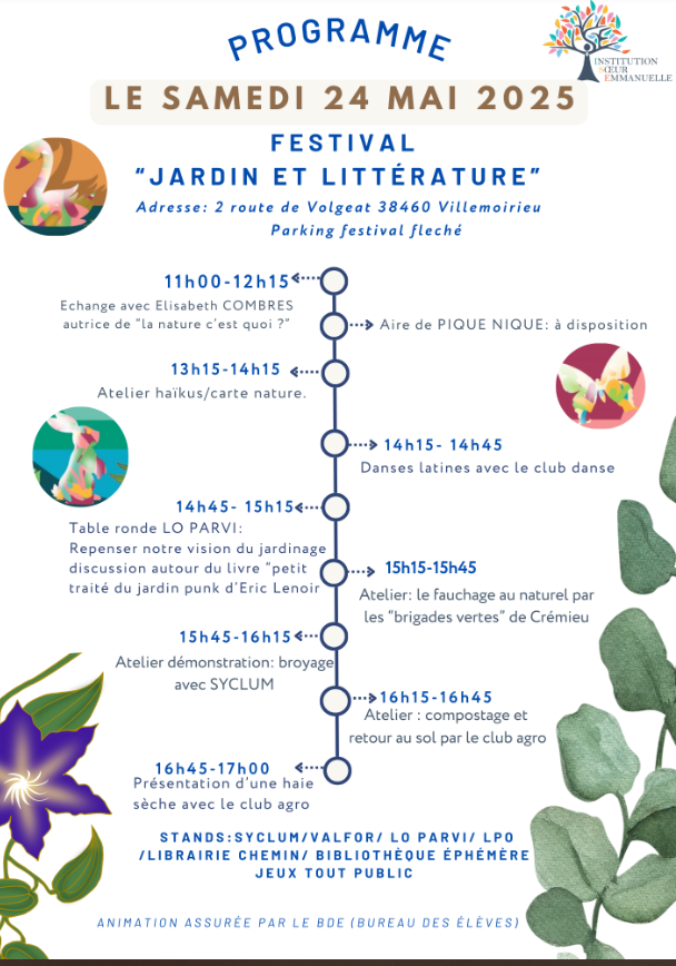 Le lendemain, le festival a ouvert ses portes par une rencontre débat avec Elisabeth Combres autrice du livre : « La nature, c’est quoi ». Puis de nombreux jeux animés par les élèves du club ont fait le bonheur des plus jeunes. Des stands tenus par le Syclum, Lo Parvi, la LPO, Vafor ont permis aux visiteurs de trouver des renseignements sur des sujets divers et aussi de répondre à leurs questions. M Chemin de la librairie de Crémieu proposait une sélection de livre en lien avec la nature et le jardinage.