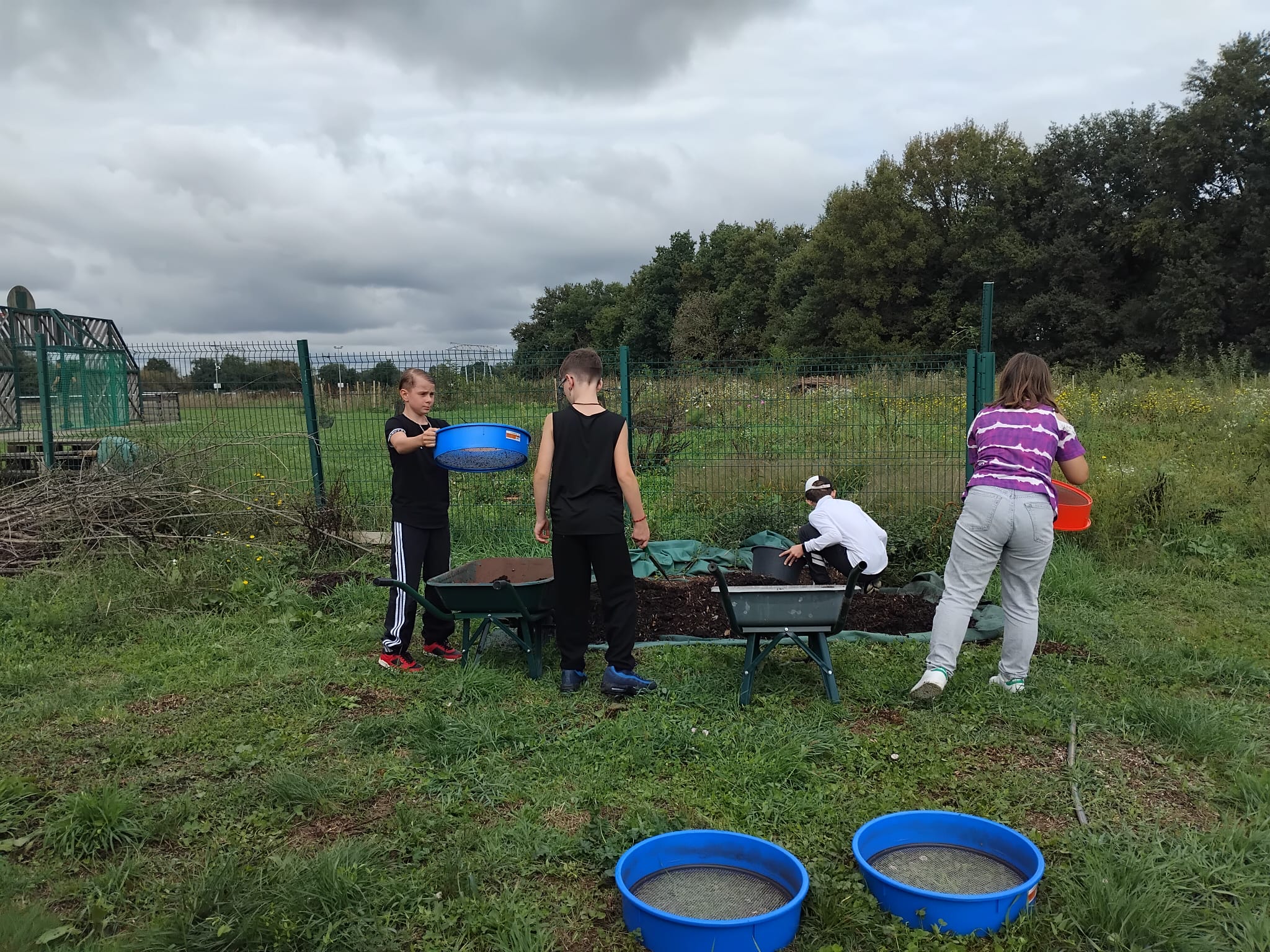 Les élèves s'activent entre le tamisage du compost mûr et les tâches pour valoriser les déchets verts. D'ici quelques semaines ils réaliseront de nouvelles lasagnes de biodéchets au jardin.