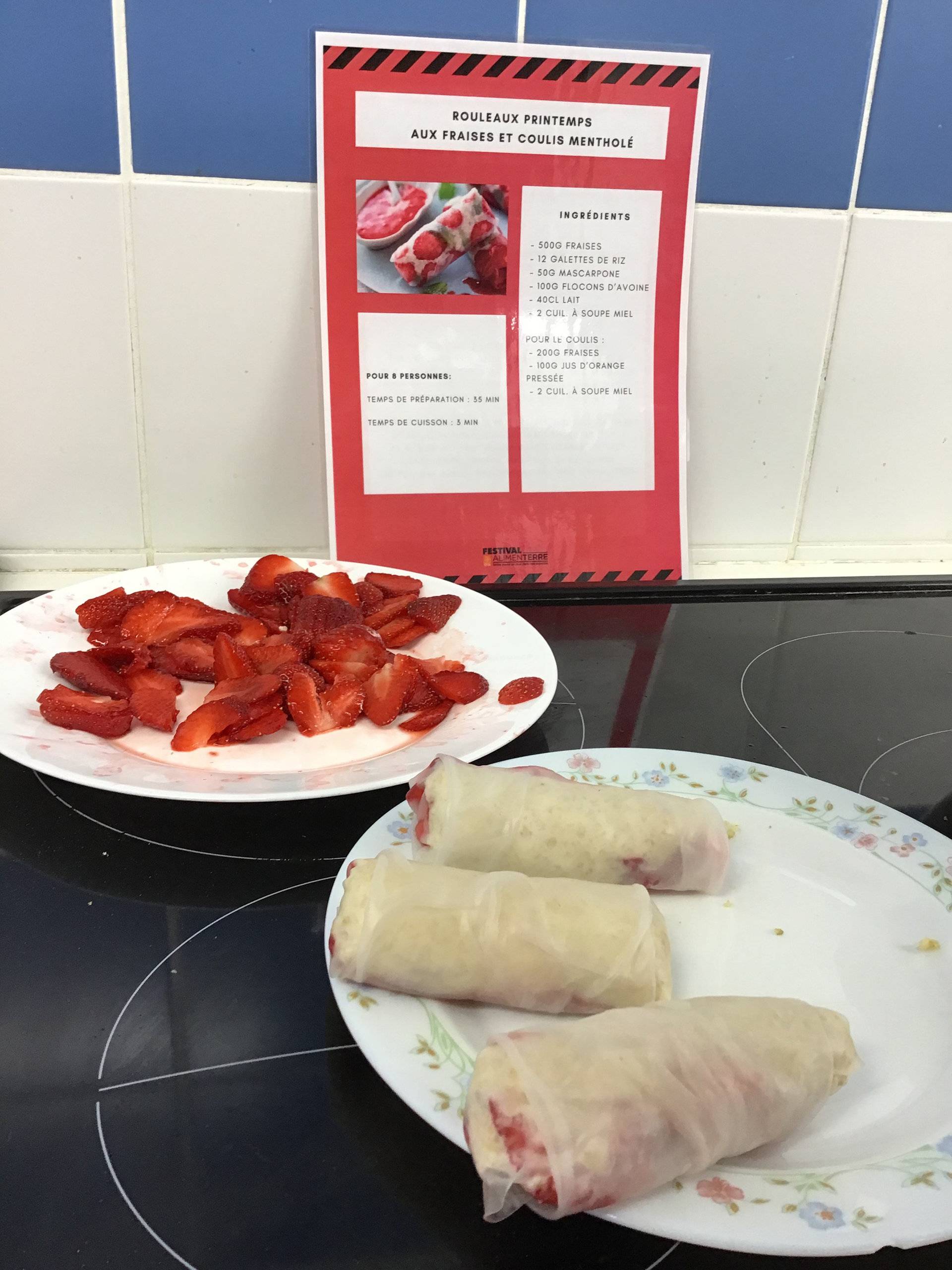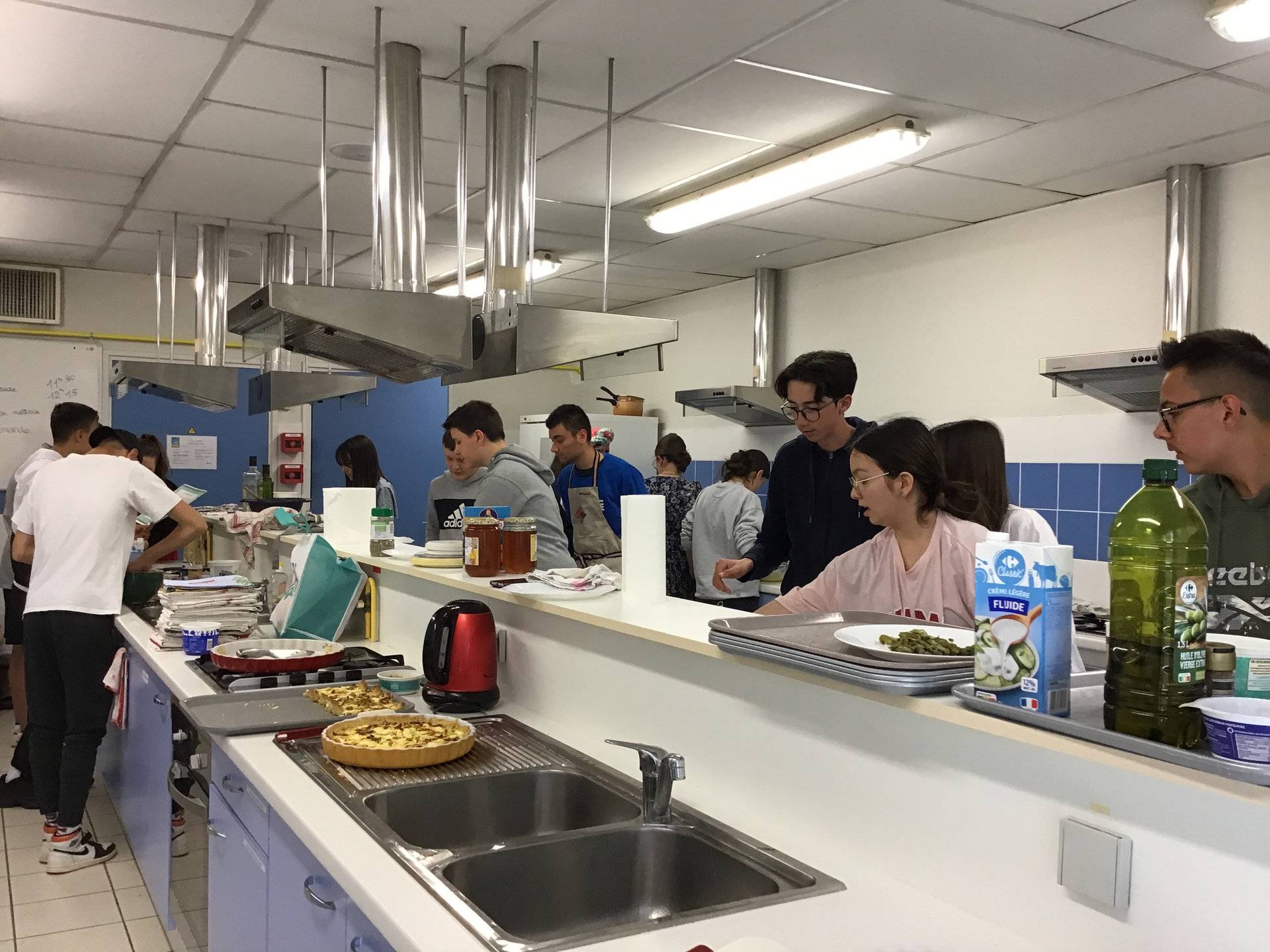 Tour à tour, à raison d'une dizaine d'élèves, les groupes se sont succédés en cuisine pédagogique pour confectionner une délicieuse tarte aux asperges et fromage de chèvre, ainsi que des rouleaux de printemps aux fraises. Ces recettes ont été confectionnées avec des produits locaux, à savoir les fraises de Tignieu et les asperges de Leyrieu.