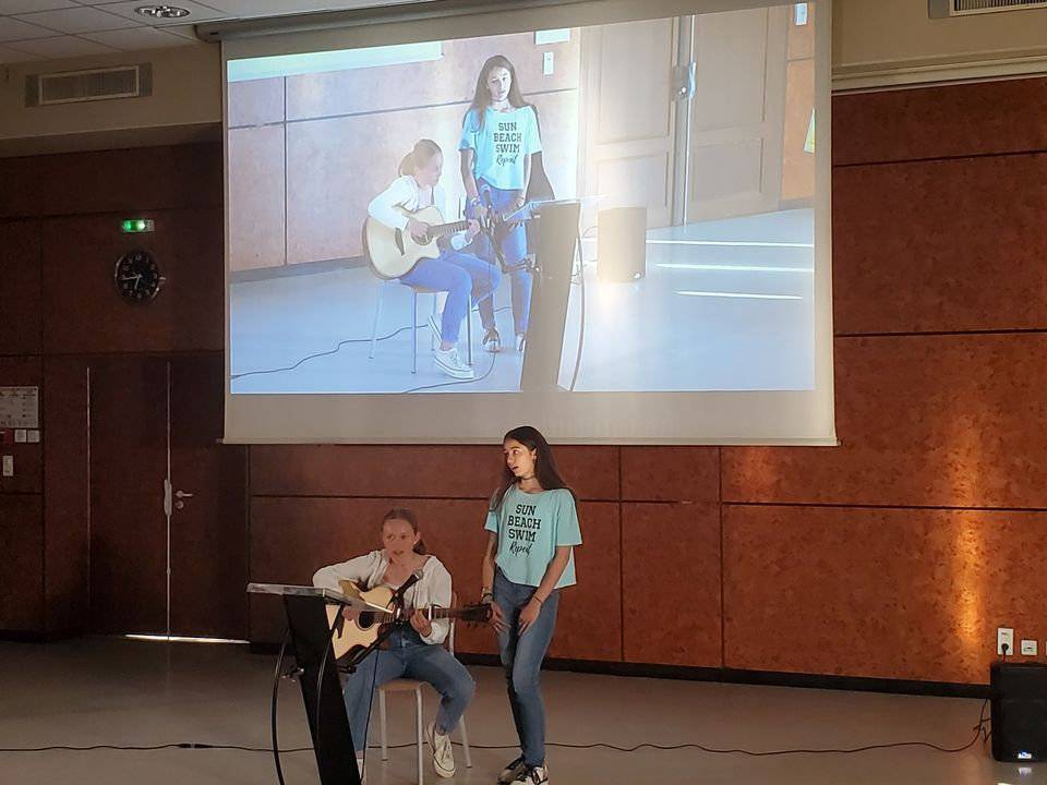 1ère : Jeanne Cluzel et Clémence Forestieri (5ème Collège) Chant et guitare
