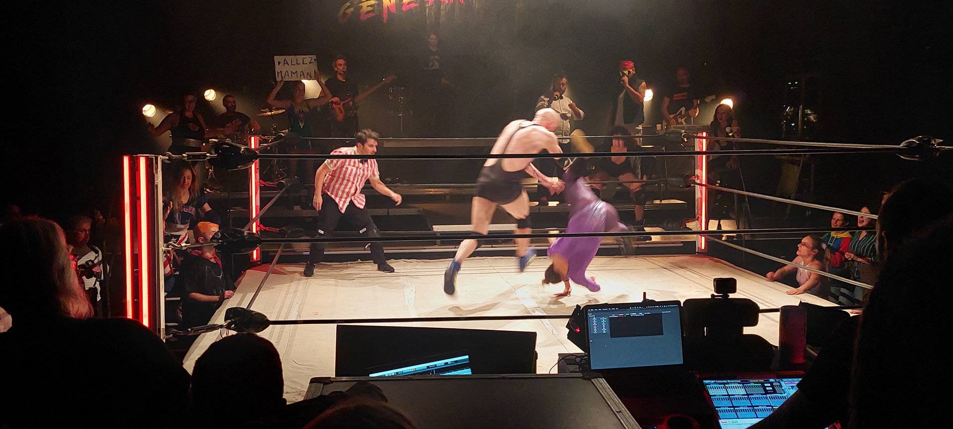 Au programme de cette soirée, la première partie était animée par DJ Harry Cover. Puis loin du catch classique, un groupe de rock ”Bagarre Générale” et une dizaine de catcheurs ont proposé un show musical plein de fantaisie, de surprises et de rebondissements.